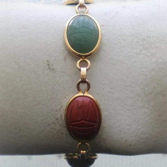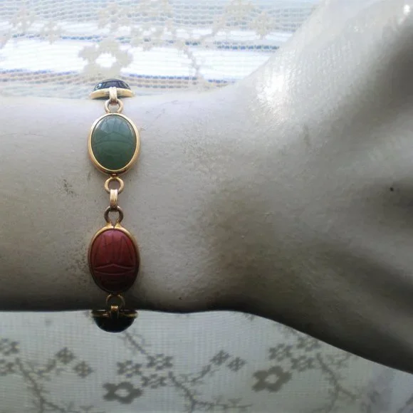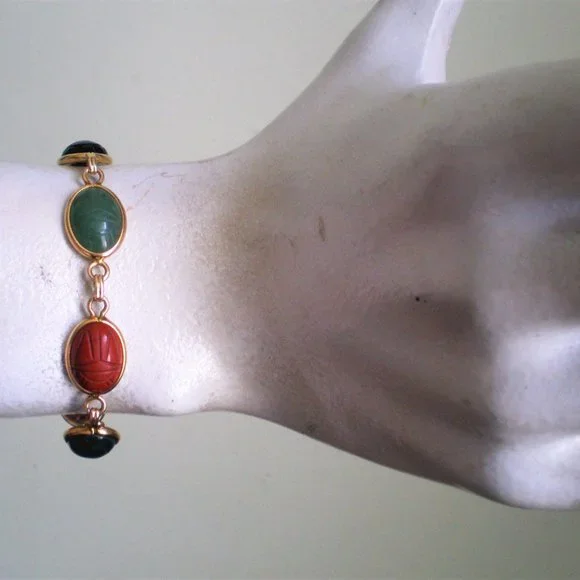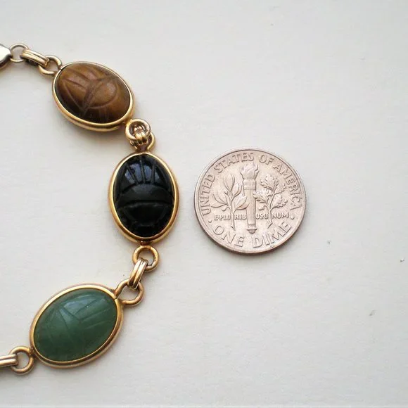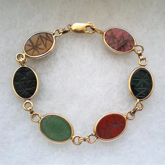 Sign up forusing my code TRAVELINGFROG to get $10 off your first purchase!Beautiful Vintage Solid 14K Yellow Gold Carved Multi Gem: Jade, Rhodonite, Jasper, Tiger's Eye, Black Onyx Scarab Tennis Bracelet about 12 grams (marked on clasp "14K" and acid tested). It is about 6 3/4" in length (with clasp) and about 11mm in its widest. Multi Gems are about 13.5mm by 10mm each. This unique bracelet is in great vintage used pre-owned condition.