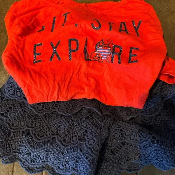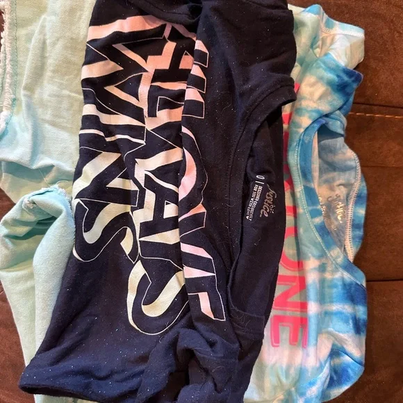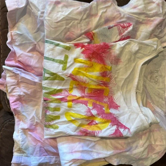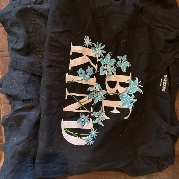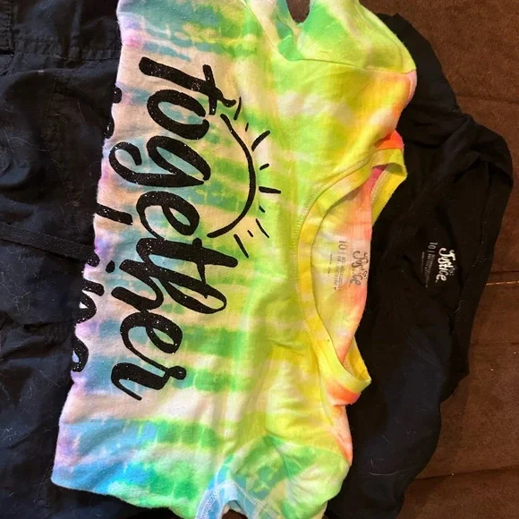 Justice bright tie dye”together we all shine” shirt sz 10Justice black ”Be Kind”shirt sz 10Justice red open shoulder “sit stay explore” shirt sz 10Justice blue tie dye”everyone loves a smart girl”shirt sz 10Justice blue tie dye”everyone loves a smart girl”shirt sz 10Justice purple floral sparkly shirt size 10Gymboree printed sparkly tank size 10Self esteem coral”Enjoy Today”top with matching striped shorts size large Justice navy sparkly “love always win”shirt sz 10Justice tiered crochet skort size 10TCP sequin heart tie dye shirt size 10TCP tie dye shortie size 10TCP mint green shorts size 10SO purple shorts size 10Arizona black shorties size 10