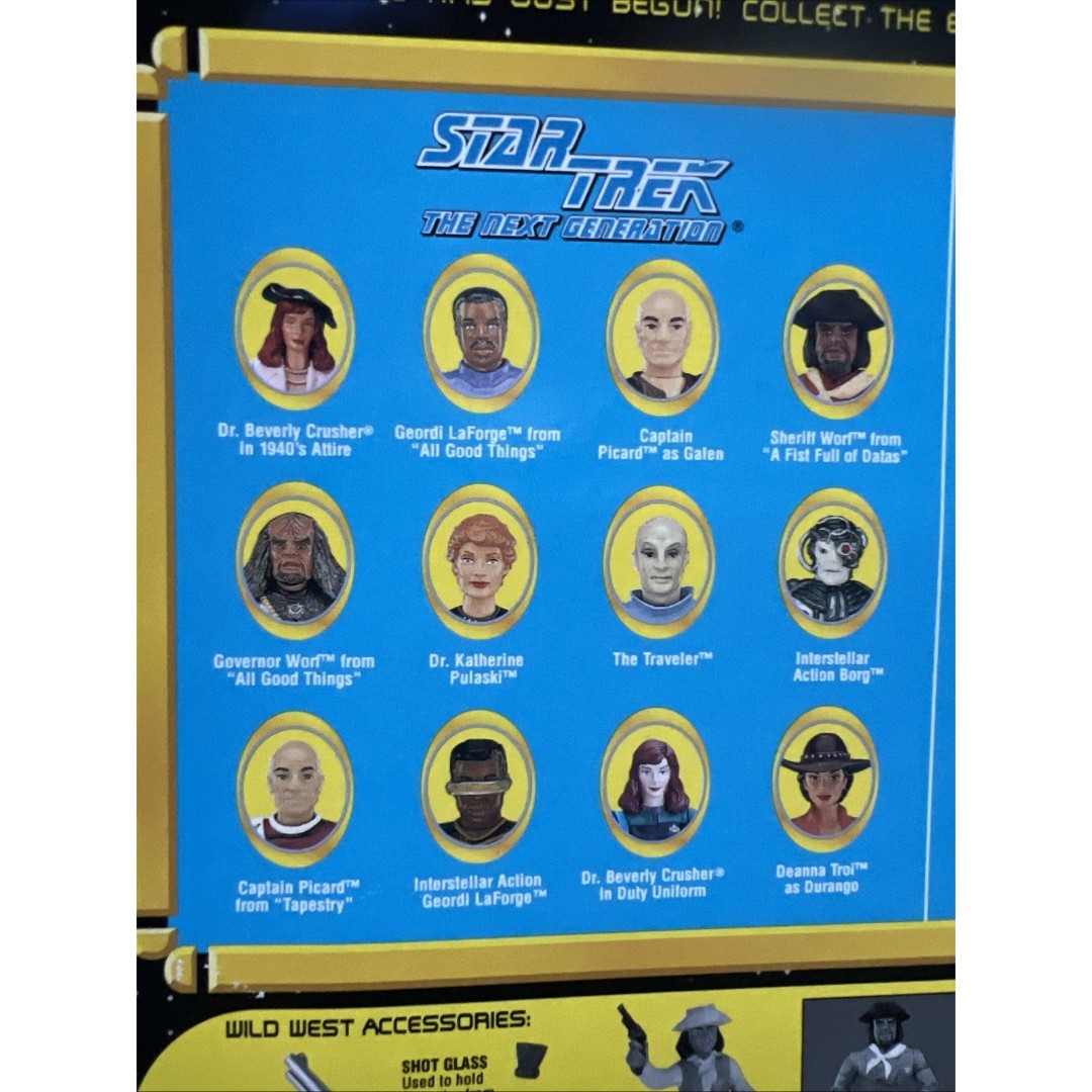 This 1995 Playmates Star Trek The Next Generation HoloDeck Series 2pc 6430 action figure set includes 3 characters: Worf & Mini Alexander & Dr. Beverly Crusher with ALL accessories. The set is made of plastic and is suitable for ages 4 and up. The items are all multicolored and come from the popular Star Trek franchise, featuring characters from the TV show Star Trek: The Next Generation. The set is an original, licensed reproduction from Playmates Toys and was manufactured in China in 1995. It would make a great addition to any Star Trek or comic book hero collection.