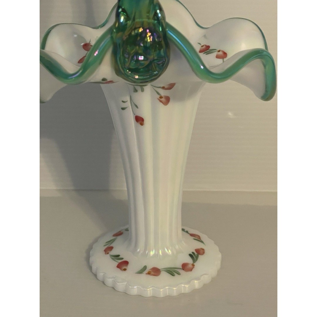 The product is a rare 2001 Fenton milk glass basket with an emerald crest and rope handle design, hand painted in white. Made in America, this original piece features a floral and garden theme, showcasing intricate hand-painted details on hand-blown glass. The Fenton brand is known for its high-quality glass pieces, making this basket a unique and collectible addition to any pottery and glass collection. basket is in excellent condition with no blemishes chips, cracks or scratches.