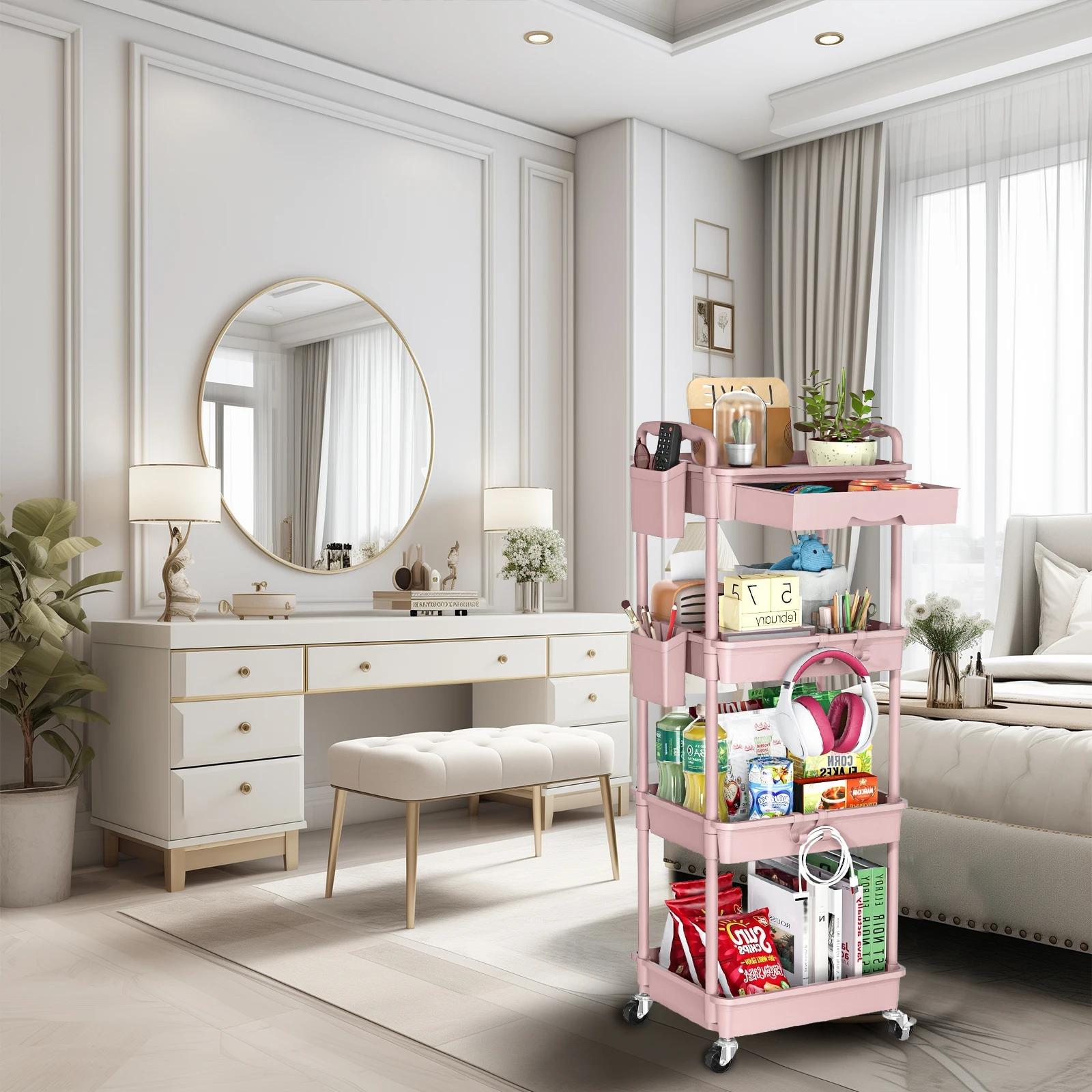 4 Tier Rolling Utility Cart with Drawer,With Drawer & Extended Poles,With Plastic Shelf & Lockable Wheels,Smooth Mobility