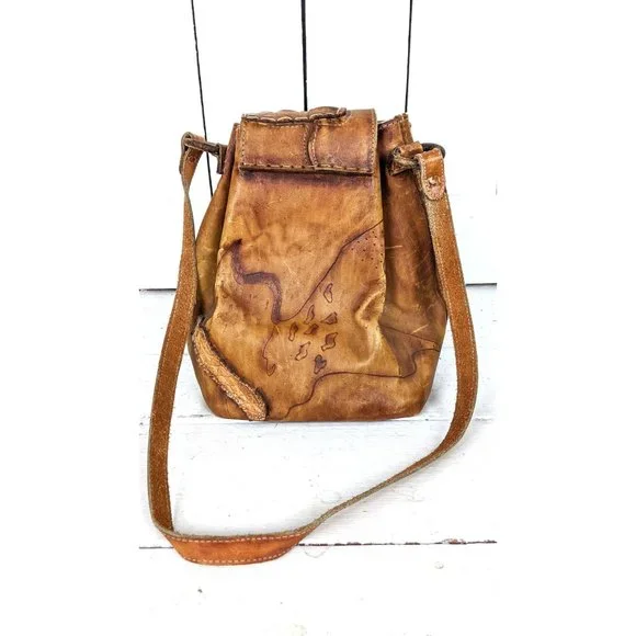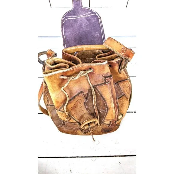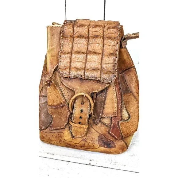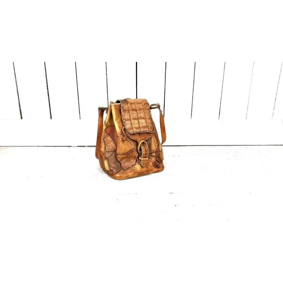 70’s vintage brown tooled patchwork leather drawstring bucket bag shoulder purseMeasurements…-height: 10.5"-width: 11"-depth: 8"Features...-thick and sturdy genuine leather-leather patchwork design throughout-embossed alligator detail-drawstring with buckle closure-class bucket bag-unlinedCondition… -great vintage condition-leather in great condition-some scuff marks/minor discoloration on the leather