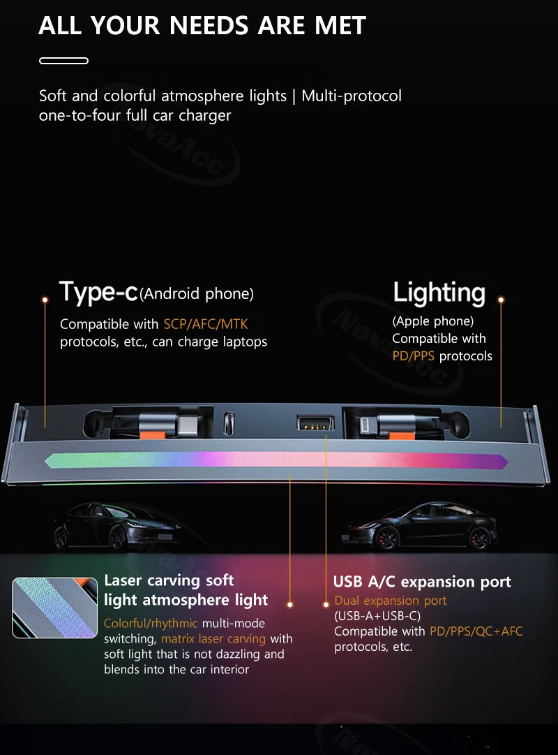 Soft and Colorful Ambient Lights | Multi-protocol One-to-Four Full Car Charger