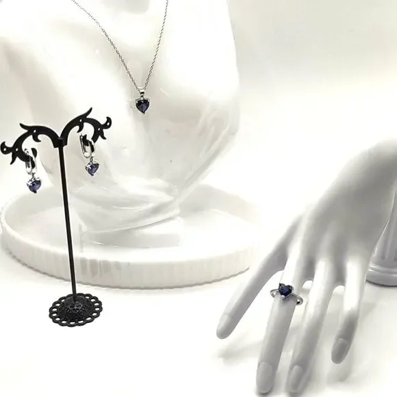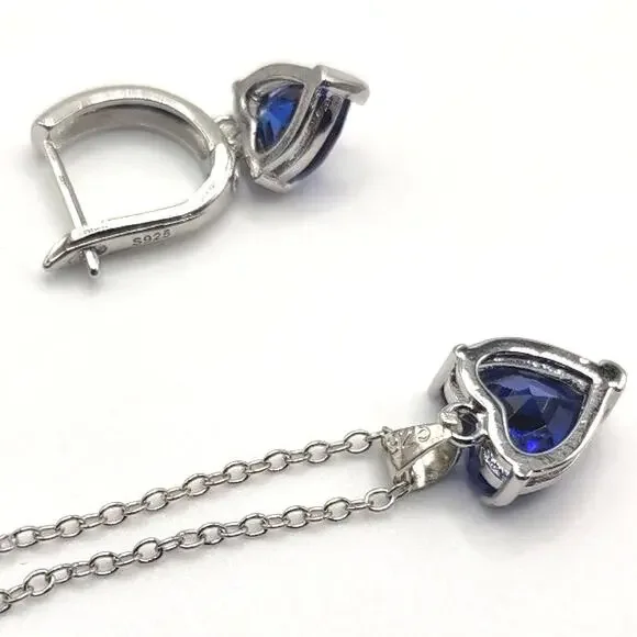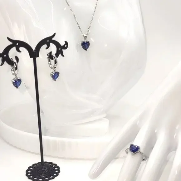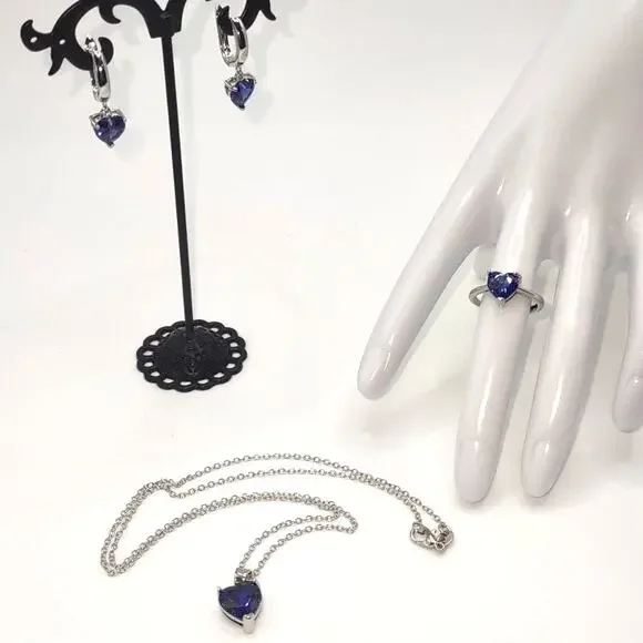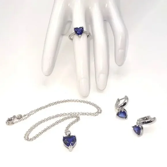 NEW 925 Sterling Silver Necklace Ring & Earrings Set Bundle Blue Synthetic Heart Gemstones With Complementary Drawstring Gift Bag.ALL JEWELRY SHIPPED SAME OR NEXT BUSINESS DAY FROM THE U.S.A.!!!BUNDLE ITEMS FOR DISCOUNTED PRICING & SAVE ON SHIPPING!!!At Jaries, we strive to be a one stop shop for all your Jewelry needs with something for everyone. We have many Styles of Necklaces, Earrings, Bracelets, Rings, Lockets & More! Feel free to message us with any questions or for recommendations! Give us a follow & check back regularly to see our newest items!With this elegant & timeless style, you'll be sure to turn heads wherever you go or make a lasting impact with a classy & thoughtful gift! Perfect as a Christmas, Birthday, Valentines, Anniversary, Wedding, Fathers or Mothers Day Present. Great for a Son, Daughter, Sister, Brother or Cousin Graduation, Quinceanera, & Sweet 16 party. A kind Get Well or Promotion Gift for an adored Grandma, Grandpa, Aunt, Uncle or Close Friend.