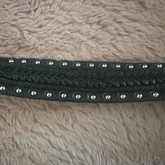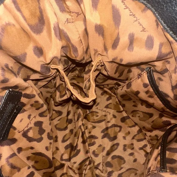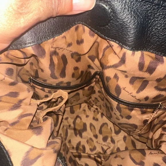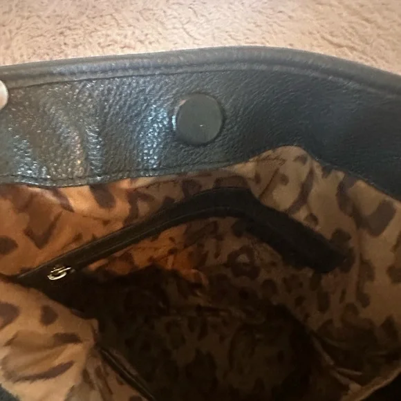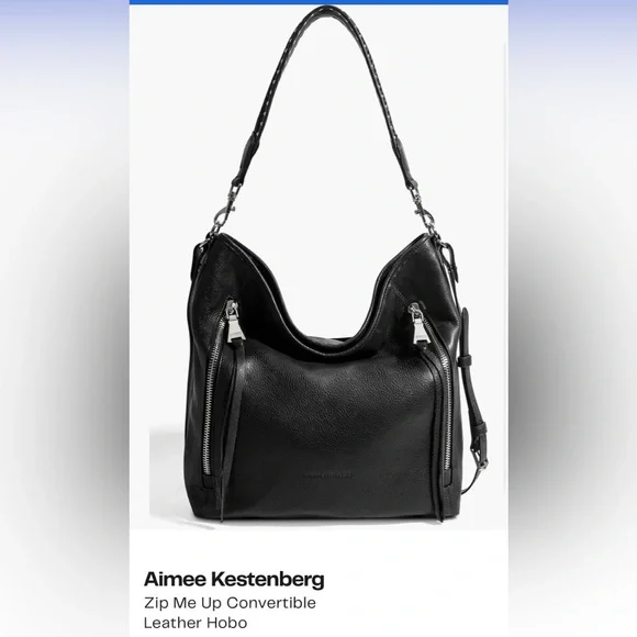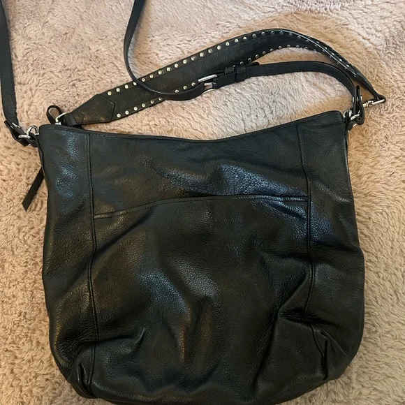 This Aimee Kestenberg shoulder bag combines sleek black leather with striking silver hardware, offering a sophisticated and modern look. Its structured design ensures durability and style, making it a versatile accessory for any occasion. The bag's spacious interior provides ample room for all your essentials, blending practicality with elegance. Used but in great condition.