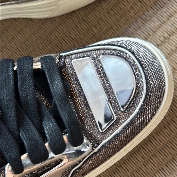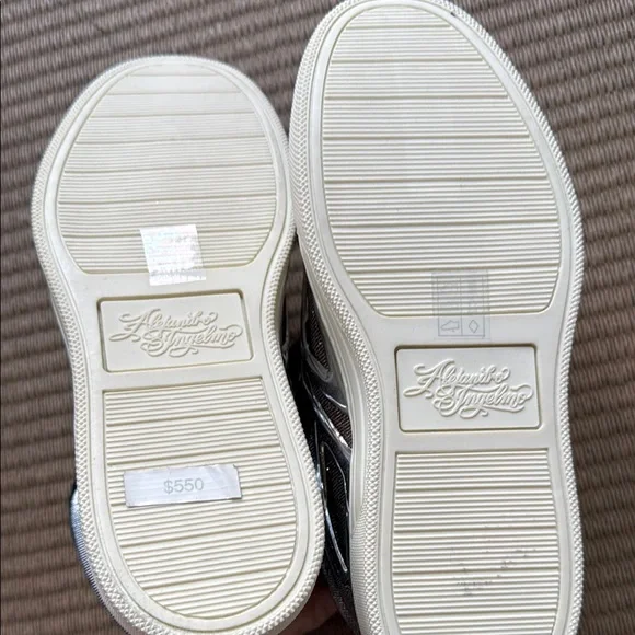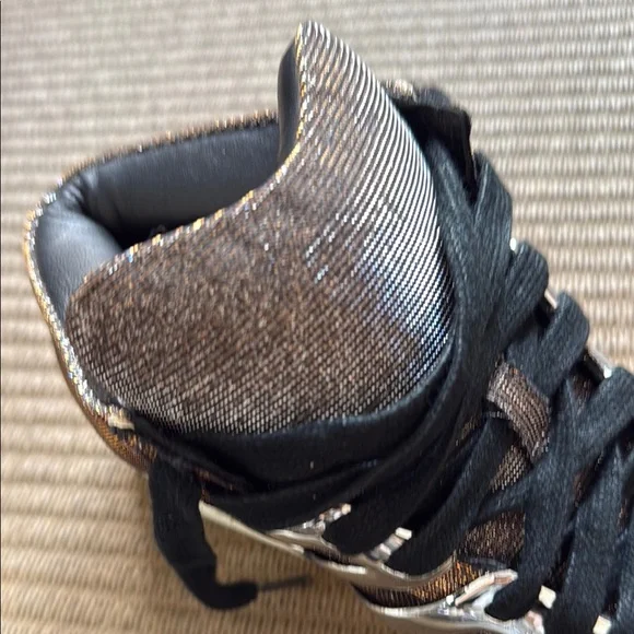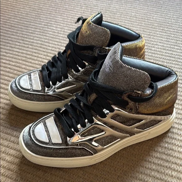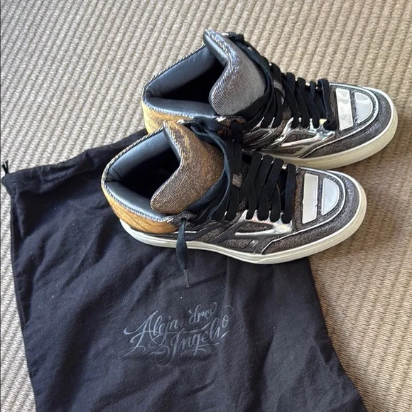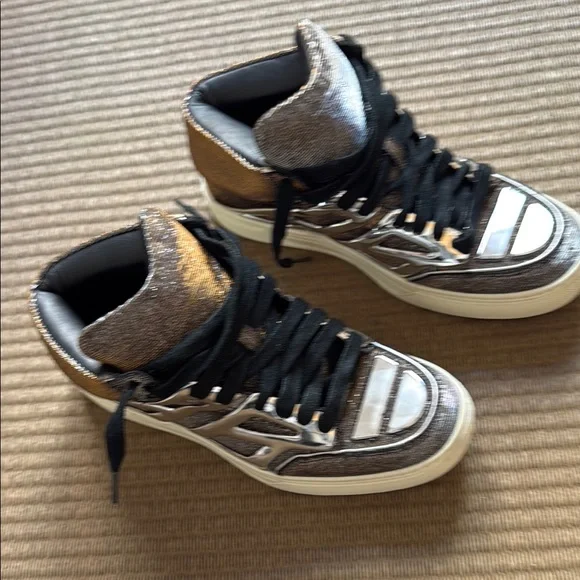 Alejandro Ingelmo rare high-top sneakers with metallic silver and gold details. Features black laces and a rare material combination design. These are new with tags and original dust bag. Women’s 7.5 wears larger. Check Alejandro Ingelmo sizing chart.