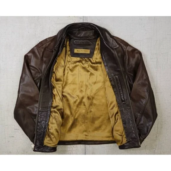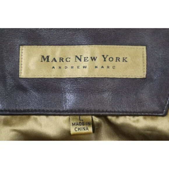 Classic brown leather jacket by Marc New York by Andrew Marc. Size L. Features smooth outer leather shell, golden polyester lining, and quality details including heavy-duty zipper with "M" pull tab and multiple interior tags.Great for daily wear, casual looks, or vintage-inspired styling.**Condition**: Pre-owned, good shape. Some light general wear as expected with leather. No major flaws.**Measurements (approximate)**:- Armpit to Armpit: 25"- Length: 29"- Sleeve Length: 24"Made in China | 100% Leather OuterShips fast with tracking. Open to offers!