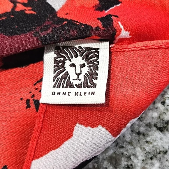 This is a pretty scarf from. Anne Klein.It is a red floral patternthis can be dressed-up or dressed-down for business, casual or a special occasion it is 100% polyester it measures approximately 13 inches wide70 inches long the scarf is pre-owned in good condition with no obvious flaws sku#bin2-19