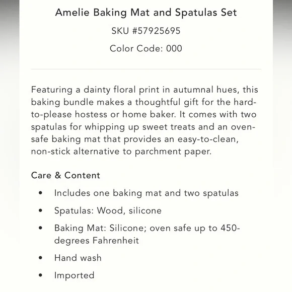 New with tag from a smoke free home. Featuring a dainty floral print in autumnal hues, this baking bundle makes a thoughtful gift for the hard-to-please hostess or home baker. It comes with two spatulas for whipping up sweet treats and an oven-safe baking mat that provides an easy-to-clean, non-stick alternative to parchment paper.Care & Content• Includes one baking mat and two spatulas• Spatulas: Wood, silicone• Baking Mat: Silicone; oven safe up to 450-degrees Fahrenheit• Hand wash* Anthropologie name crossed out with sharpie.* The price tag could be blacked out and/or removed from item.