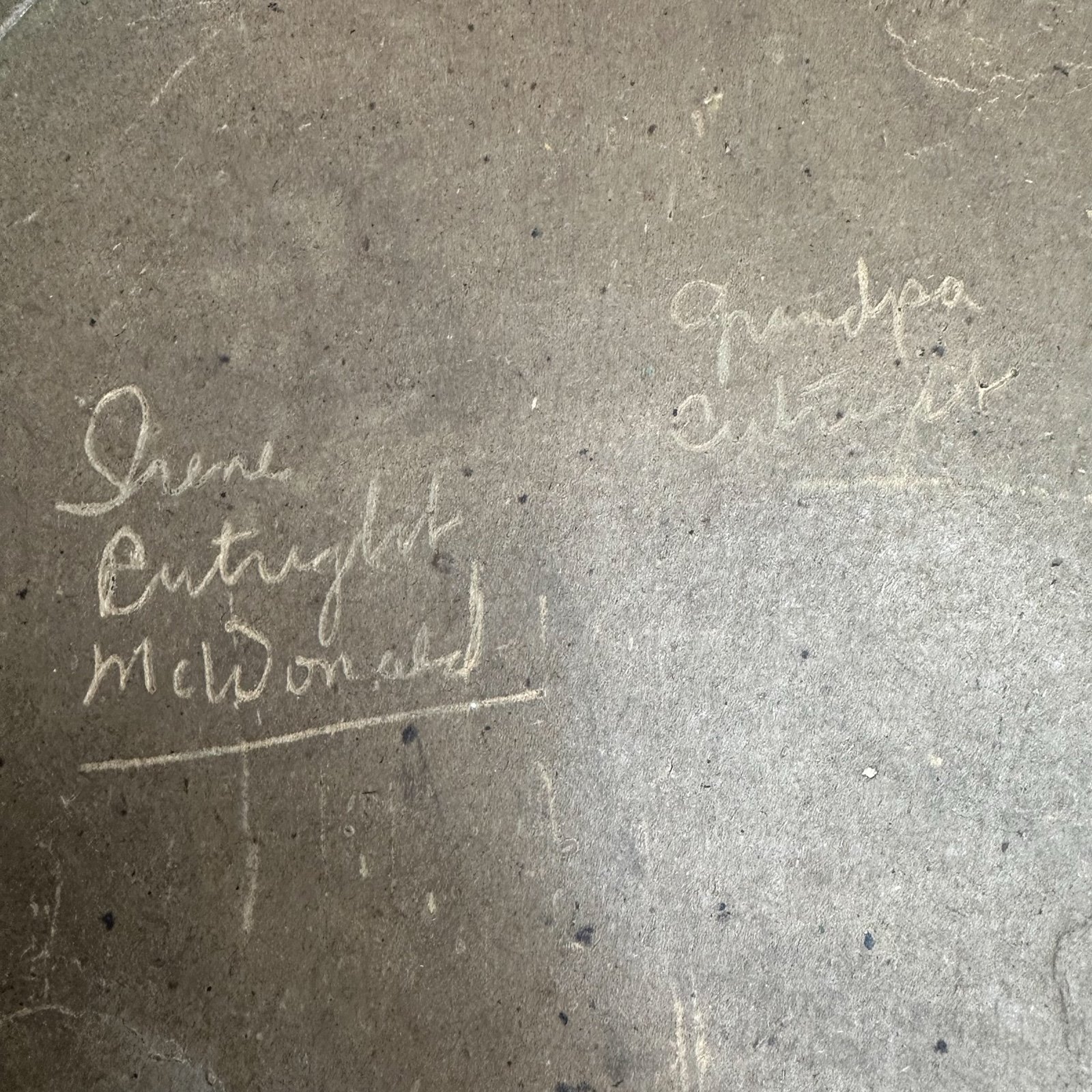 Frame measures 24"x18" and is in really good condition. The picture itself has a damaged spot on it in the lower left corner by the little boy's knees. The damaged spot could probably be repaired if somebody really wanted to. On the back is the signature of everyone in the photo. {See photos}