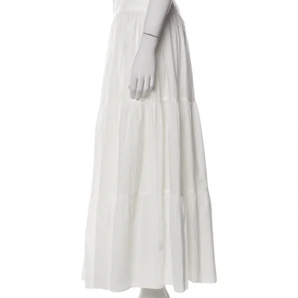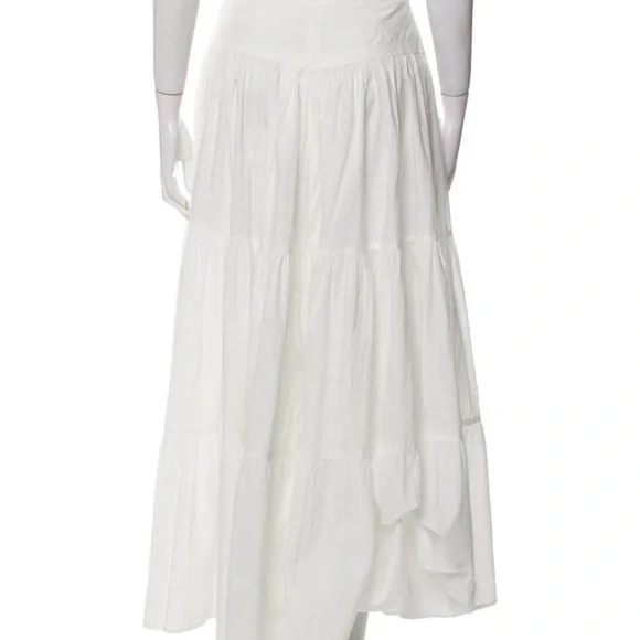 This stunning white maxi skirt by Apiece Apart features a tiered A-line design, perfect for bridal or cocktail occasions. Its flowing silhouette and crisp fabric offer a graceful and elegant look, making it a versatile addition to any wardrobe.Waist: 25.5"Hip: 36.75"Length: 37.25"Fabric: 100% Organic CottonClothing Size: SForeign Size: US 4