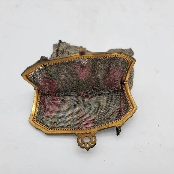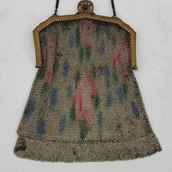 This is a very nice Art Deco Era Whiting and Davis flapper-style handbag.The body of the bag is made of soldered steel mesh, decorated in the Dresden style with pink, blue, green, and purple enamel.The inside of the clasp is stamped 'Whiting and Davis'.The purse is in good vintage condition for its age and use.The body of the purse measures 5.8" from the top of the clasp to the base of the mesh. The clasp/lip of the purse measures 4" across. The chain measures 12" in total length.