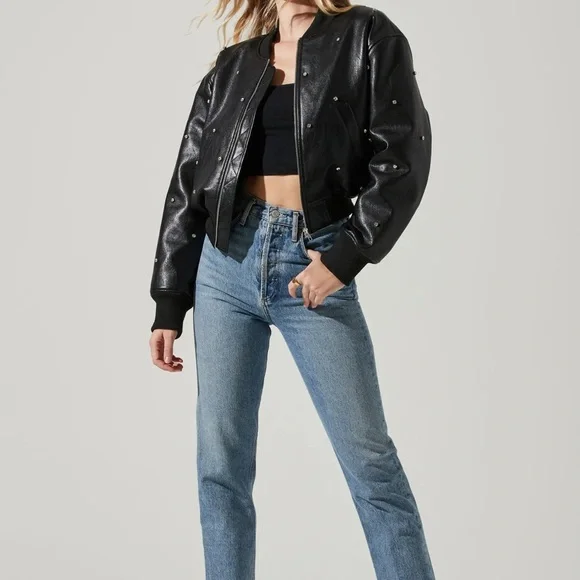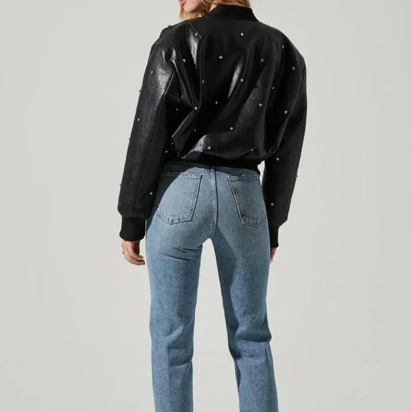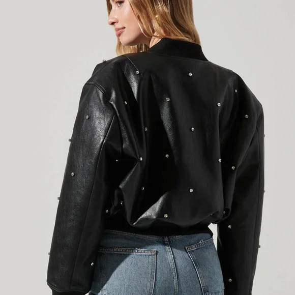 The Astr Black Bomber Jacket offers a sleek and contemporary look with its glossy finish and zippered front closure. Designed with ribbed collar and cuffs, this jacket provides a stylish and versatile addition to any wardrobe.AVIANNA EMBELLISHED FAUX LEATHER JACKETFaux leather finish with rhinestone embellishmentsRibbed collar and cuffsFront zip closure and side pocketsDry clean onlySelf: 45% Polyurethane. 40% Polyester. 10% Viscose. Lining 100% Polyester. Rib Trim: 100% Polyester