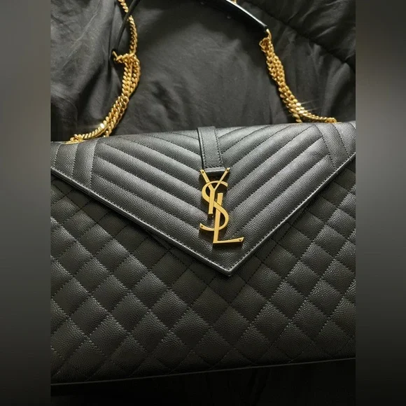 YSL Envelope Triquilt Large Shoulder Bag in Grained Leather. Worn a few times and still in great condition! Comes with dust bag. Saint Laurent shoulder bag in chevron/diamond-quilted, chrome/metal-free tanned leather.Golden metal hardware.Sliding chain and leather shoulder straps, doubled 11.8" drop and unfolded 20.4" drop.Envelope flap top with YSL logo; magnetic closure.Exterior, one slip pocket at back.Interior, grosgrain lining; one slot pocket.8.6"H x 12.2"W x 2.9"D.Approx. weight 2.3 lb.Made in Italy.