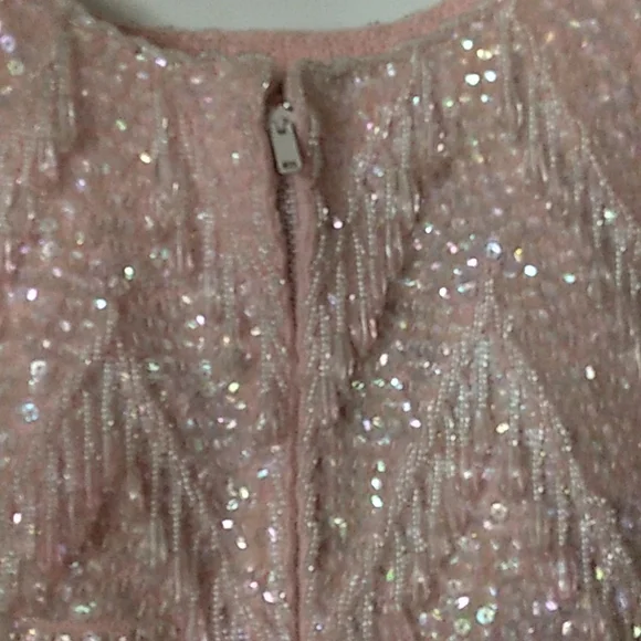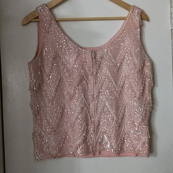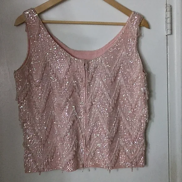Authentic Vintage 1960s Hand Beaded on 100% Knit Wool made in Hong Kong Size Large from an eccentric Aunt most likely never worn Back Zipper Dimensions Bust 36" Shpulder to hem 20" no flaws