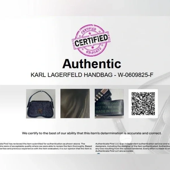 Authenticated Karl Lagerfeld Jeans Shoulder BagComes with Certficate of AuthenticityThis is a sample bag and very rare.Sample bags are produced by designers as samples. Sometimes they go into production but sometimes they do not ever get produced which makes them far more valuable.So far, I have not found another one like this!Karl Lagerfeld Logo plate on front of the bag.Top handle with 3.5” dropOptional crossbody strap is MISSING (stock image #1 shows crossbody strap)