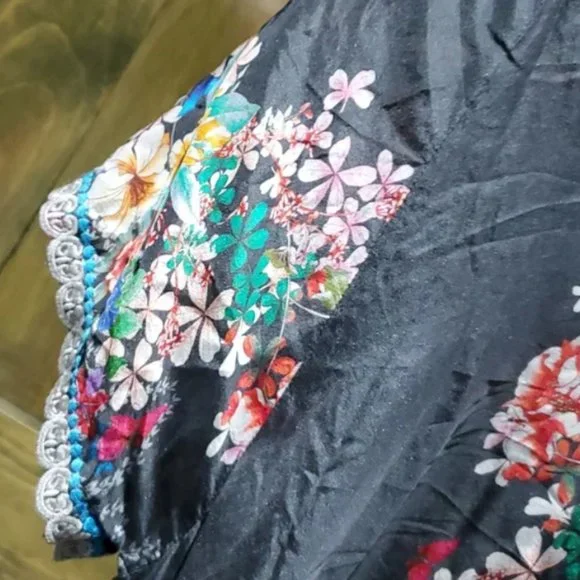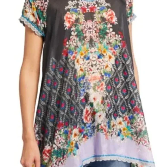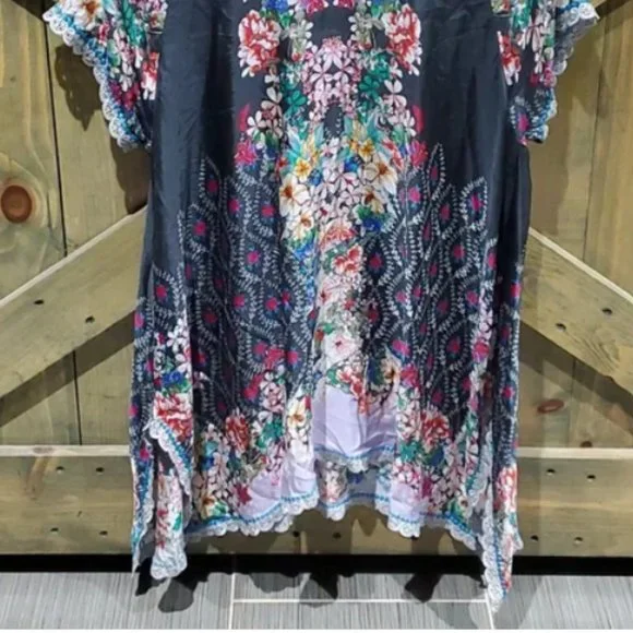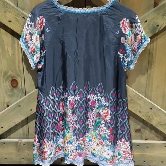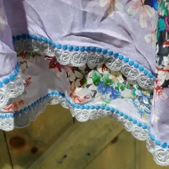 Cute lace trim on Gray body with floral patternMixed printScalloped edgesV neckShort sleeve,Relaxed silhouettePull over styleVarious colors Gray blue pink Orange green Brown purpleApprox. measure21 inches across chest from pit to pit 30 inches from top to bottom in back and 28 inches from top to bottom in frontP12958