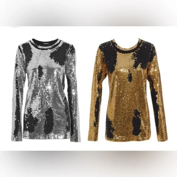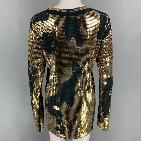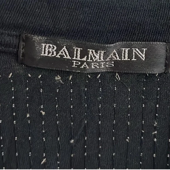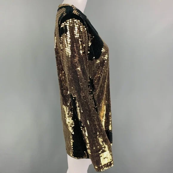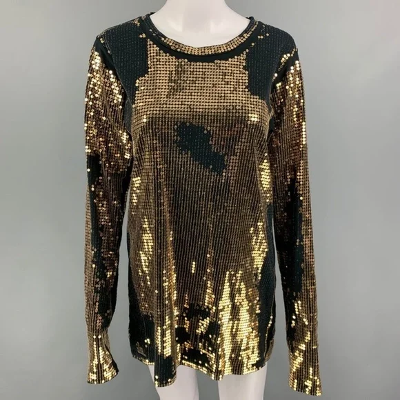 Upgrade your style game with this high-end authentic Balmain long-sleeve T-shirt, perfect for standing out in any crowd. This eye-catching piece features dazzling gold sequins that pop against the bold black fabric. Made with top-quality materials, this T-shirt is all about mixing glamour with a cool, edgy vibe. Ideal for nights out or casual hangouts, it's your go-to for making a statement and turning heads wherever you go.Condition: great preowned condition - no major flaws noted Comes from a pet and smoke free home