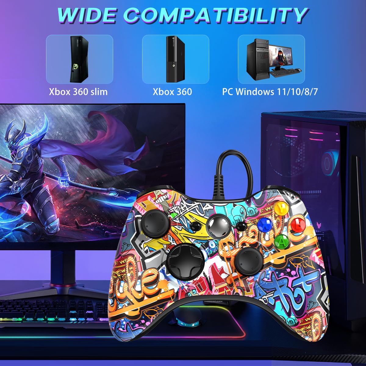 Cool Designs The 360 controller was carefully designed to show off the graffiti style, it brings lift to your regular boring controller Wide Compatibility The 360 controller is compatible with 360, 360 slim and PC Windows 11/10/8/7 Dual Vibration Feedback Provide dual vibration motors, pc controller can automatic feedback according to the game scene Easy Operate This USB controller is with a 7.2 feet USB cable, plug and play Precise and Responsive Controls 360° Joystick, precise triggers, responsive action buttons, and a 4-way directional pad