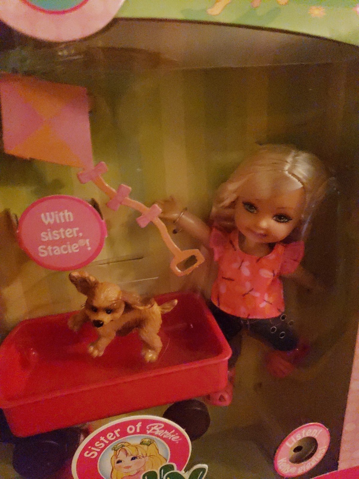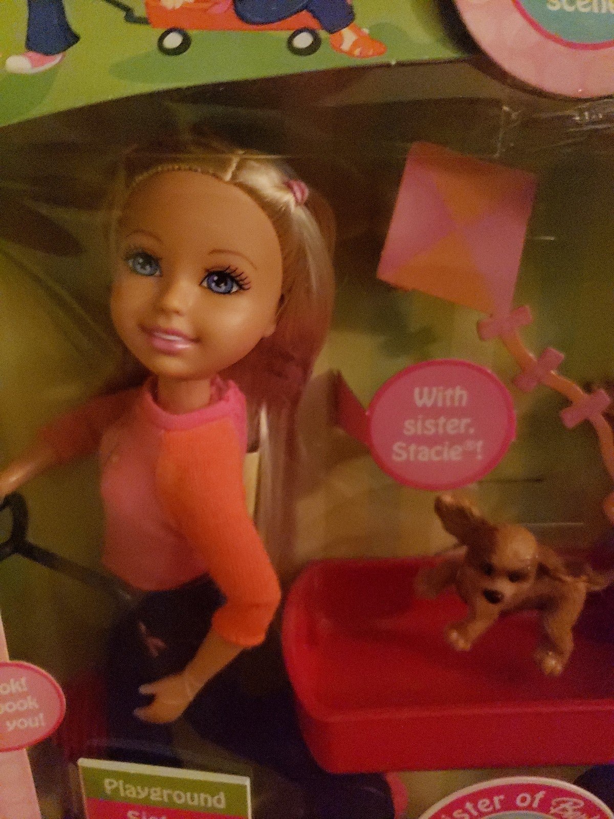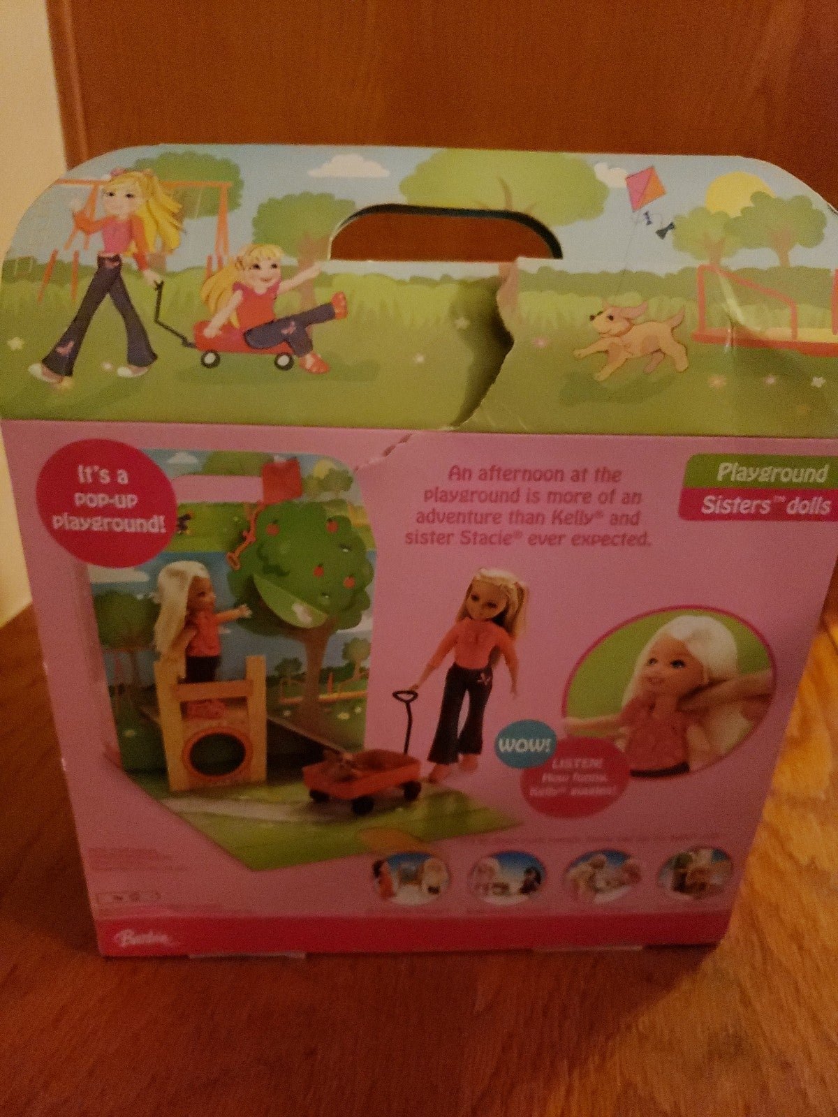 NRFB 2006 Kelly and Stacie Playground Sisters with wagon. Very cute sisters playing together with wagon and puppy. Includes miniature book. Kelly giggles feature. Replacement batteries required due to age. The box has a dent on the front right side, top and lower. There is a crease/dent, left side and bottom of the box. A tear in the back of the box. The dolls and accessories are mint. These dolls are no longer being made this size. Review carefully. Comes from a clean, smoke free home. Thanks for looking.