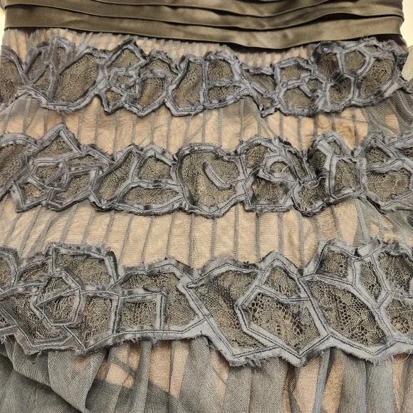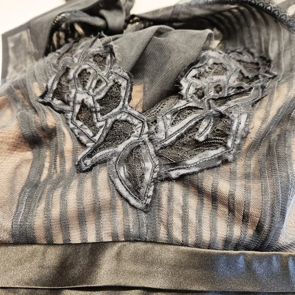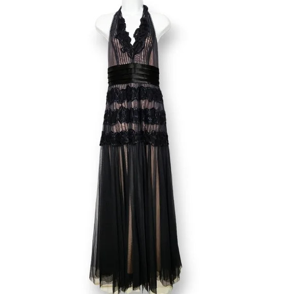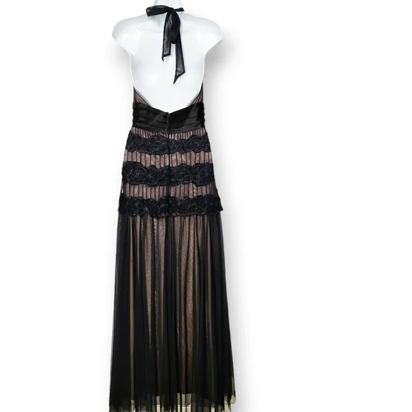 BCBG MaxAzria Black Tulle Lace Halter Gown Maxi Dress. Stunning gown to wear to your next formal event. It has an adjustable halter neck lined in lace with sheer black tulle over a nude lining. Please note that the size tag is missing and I'm estimating this to be a size 4. See measurements below for fit.Approximate Measurements Laying Flat Armpit to Armpit - 14.5"Waist - 14"Length - 63" adjustable Great Used Condition From a Smoke Free Home