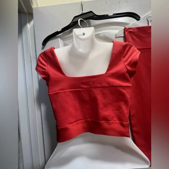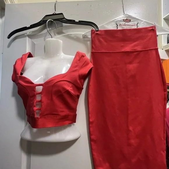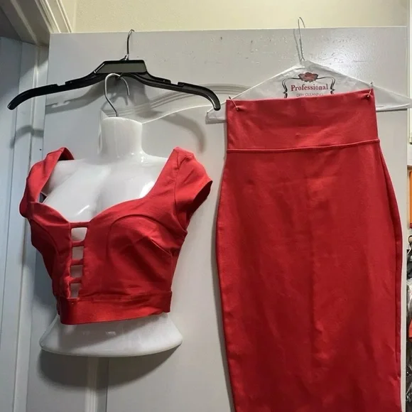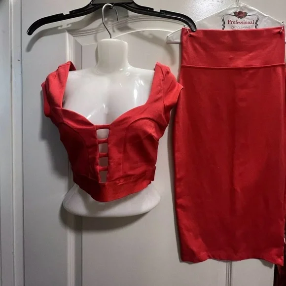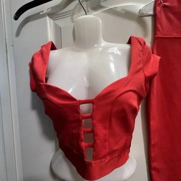 This bebe two-piece lace short skirt set in red is the perfect outfit for any occasion. The delicate lace fabric adds a touch of elegance, while the red color makes a bold statement. The set includes a skirt and top, both in size XS and made for a regular fit.The outfit is perfect for weddings, parties, or casual events. The fabric type is lace and it requires dry cleaning only. The set is pre-owned but in excellent condition. It is a must-have for any fashion-forward woman who wants to make a statement.
