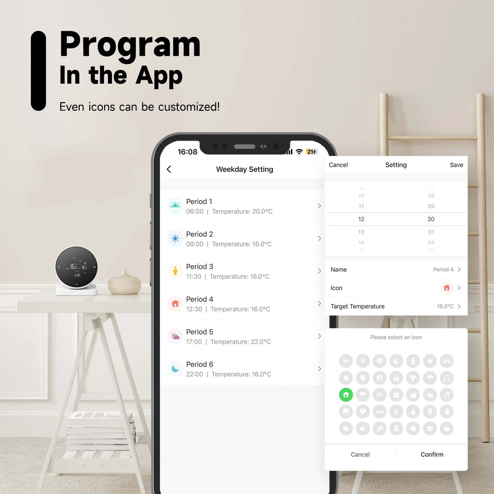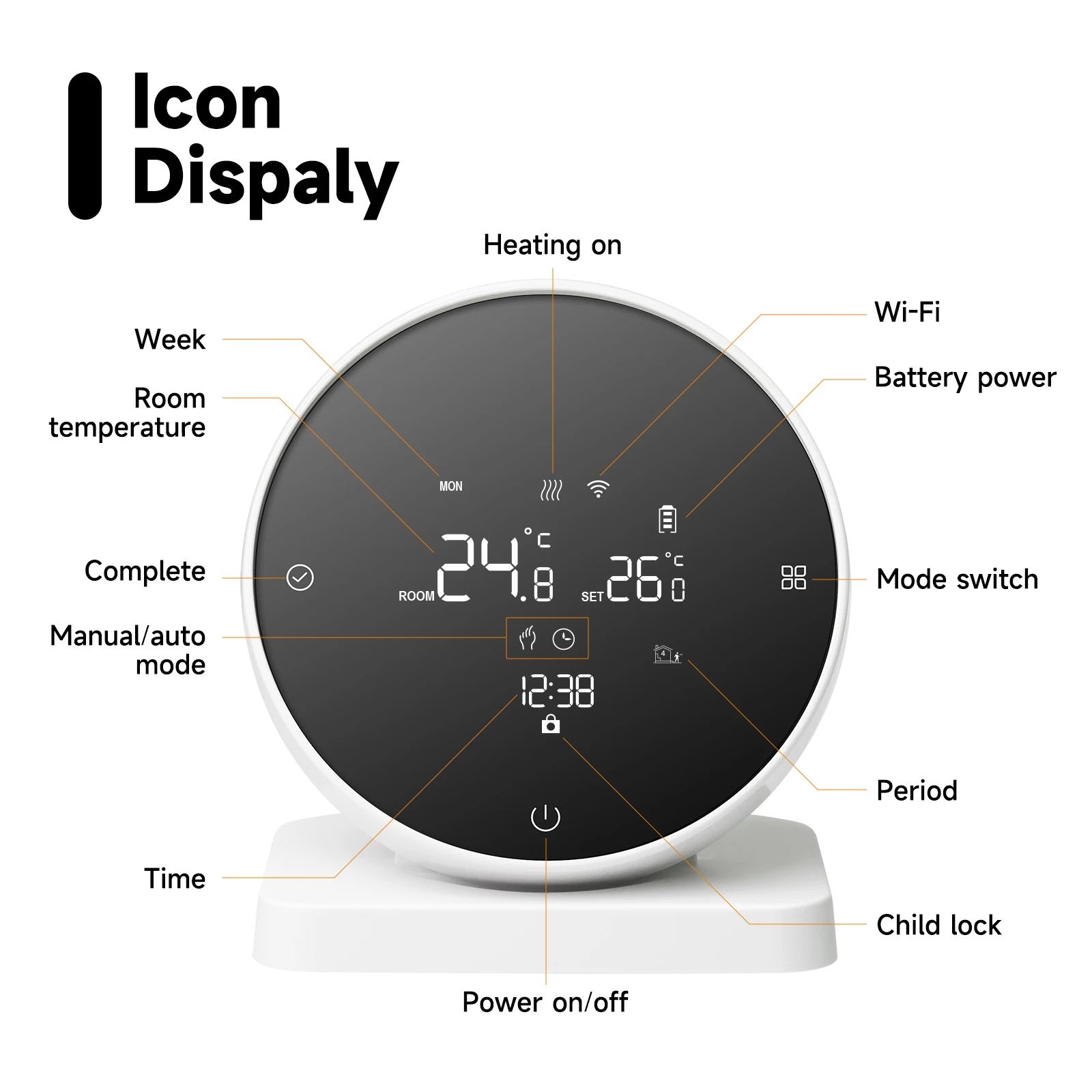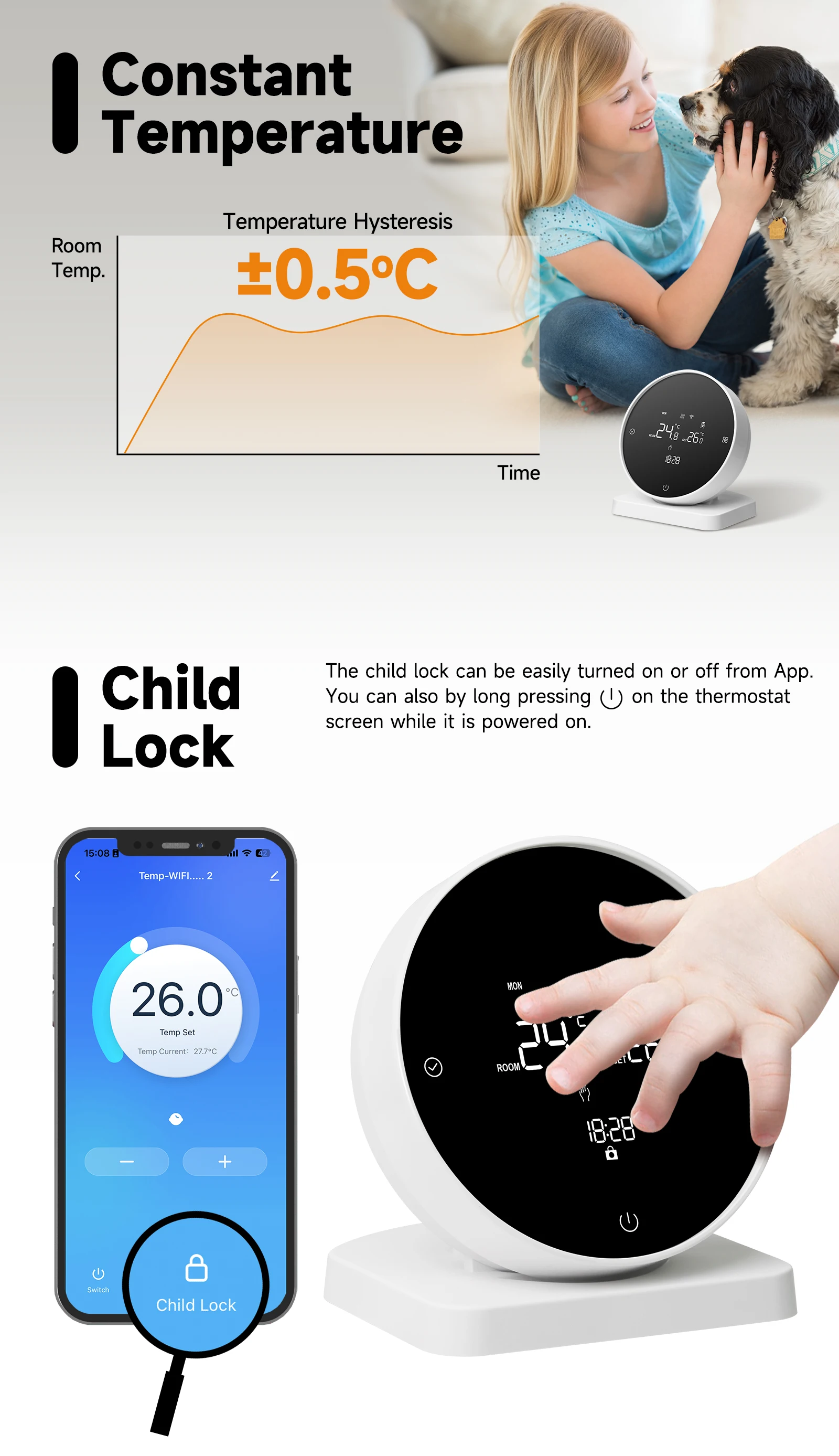 【Programmable】It can be programmed by phone or manually, with programming 3 modes of 5+2/6+1/7. Different temperatures can be set for 6 time periods workday.