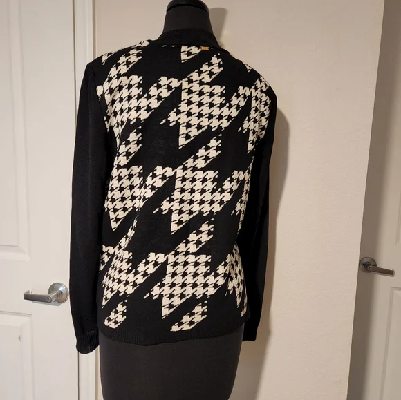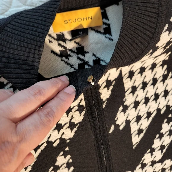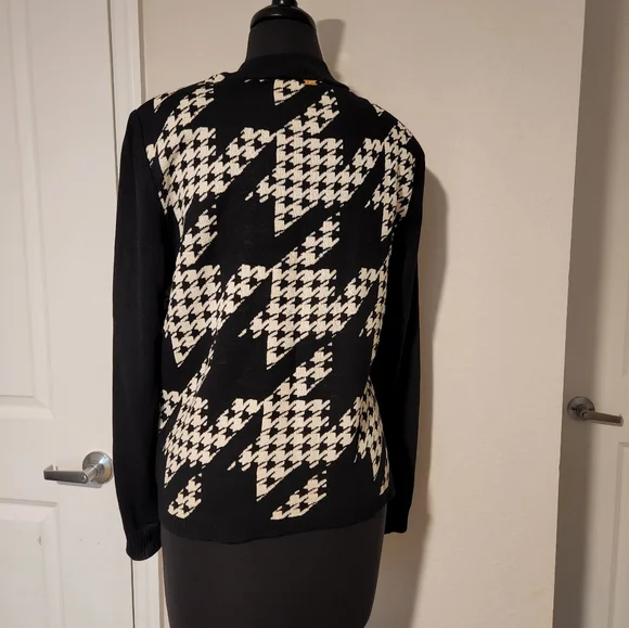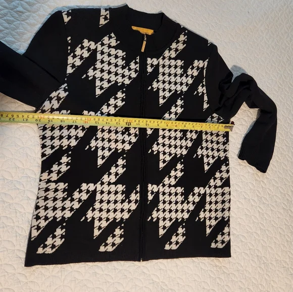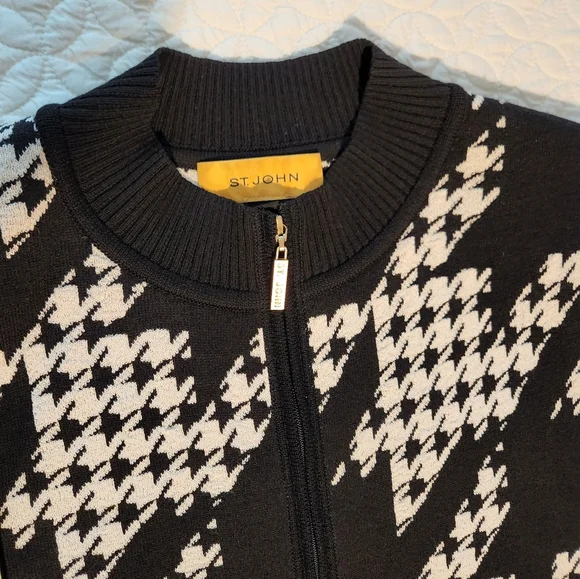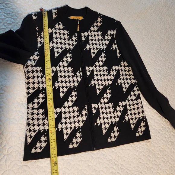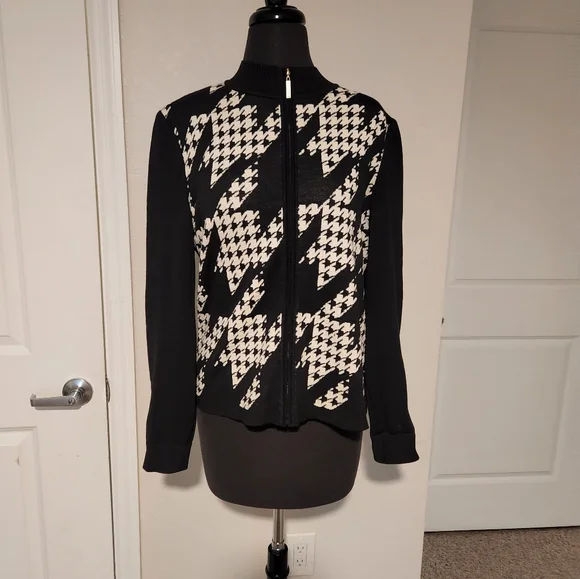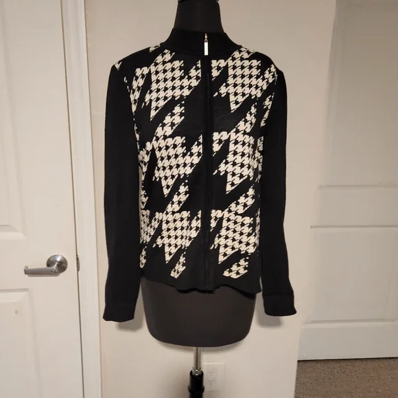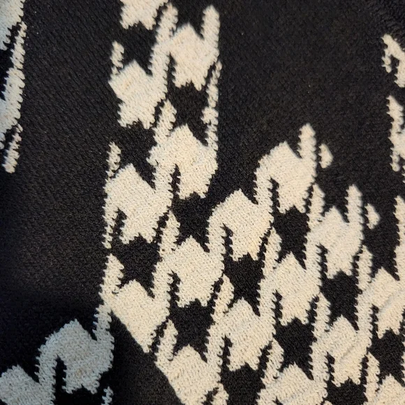 This blazer features a striking black and white houndstooth pattern, offering a sophisticated touch to your wardrobe. The ribbed cuffs add a unique twist to the classic blazer design, making it perfect for both formal and casual occasions. Its tailored fit ensures a polished look, ideal for any setting, small stains ck picture