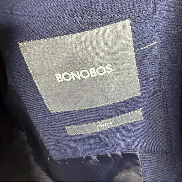 Bonobos Jetsetter Wool Blazer Navy 40R Athletic Fit 2-Button Stretch GUCClassic and versatile Bonobos Jetsetter blazer in navy blue, size 40 Regular (Athletic Fit). Crafted from a comfortable wool-stretch blend, this jacket features a sharp, modern silhouette perfect for work, travel, or special events.Features:•Color: Navy Blue•Size: 40R (Athletic Fit)•Fabric: Wool blend with stretch•Style: Two-button front, notch lapels•Details:•Double vent in back•Bemberg lining•Interior passport pocket (great for travel)•Non-functioning button cuffsCondition: Gently used condition – small mark present (see photo). Structurally excellent with light wear.Measurements approximately 20 1/2 inches under arm to under arm 27 1/2 inches longOver 1400 listings. New Items added daily. Men’s and Women’s. Bundle Discount is 4 or more 25% off transaction. Up to 10lbs. One Shipping Price.