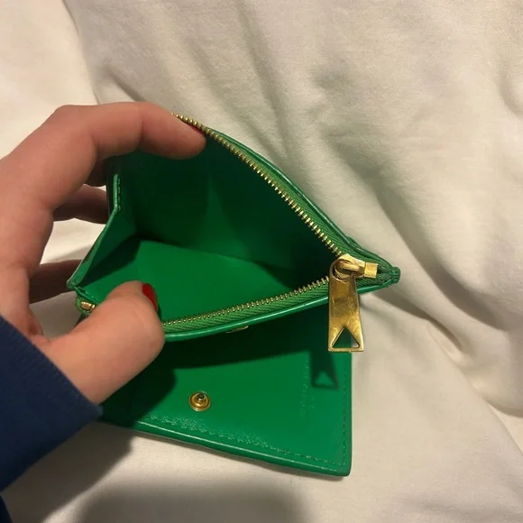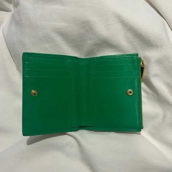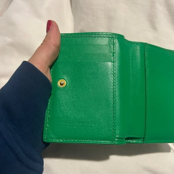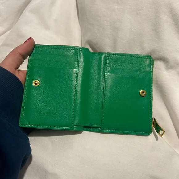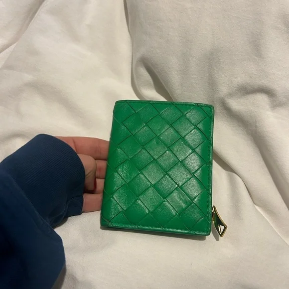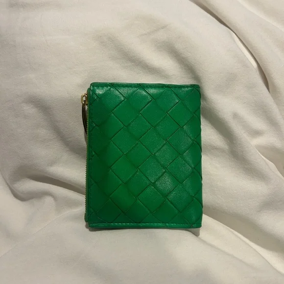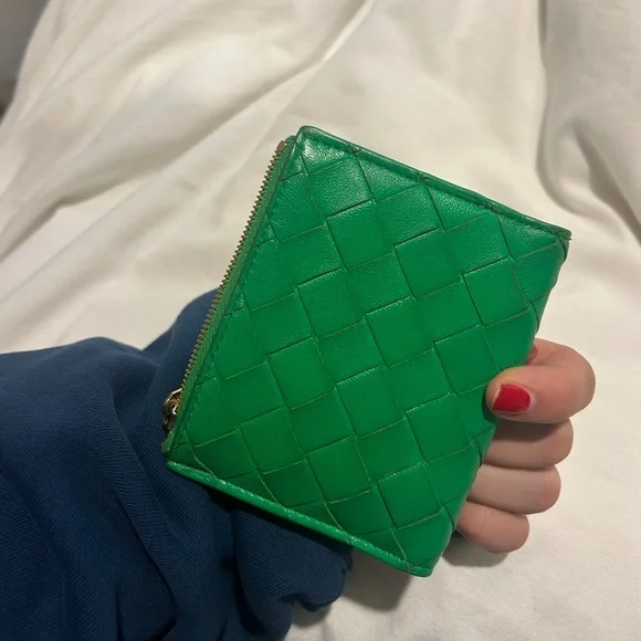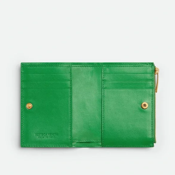 Includes box. In great condition. Some slight discoloration noted at raw ends of cross stitch. Small bi-fold wallet in Intrecciato nappa leather.• Intrecciato nappa leather wallet• Six card slots, one note compartment, one zipped coin purse• Press-stud closure• Lining: Calfskin• Colour: Parakeet• Hardware: Gold finish• Height: 11.5 cm | 4.5"• Width: 9 cm | 3.5"• Depth: 1 cm | 0.4"Made in: ItalyProduct code: 740309VCPP33722