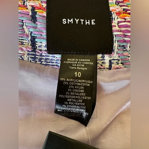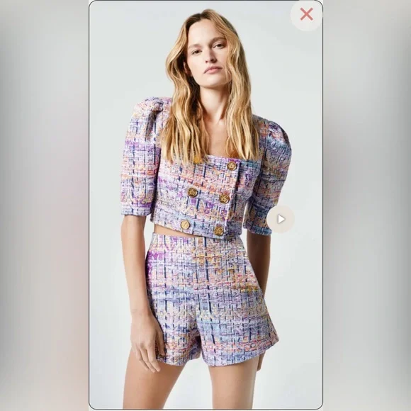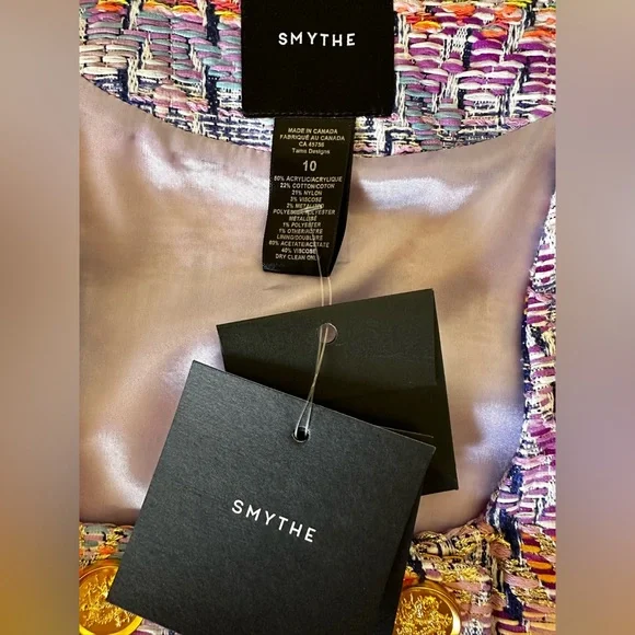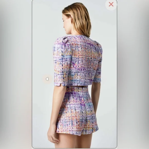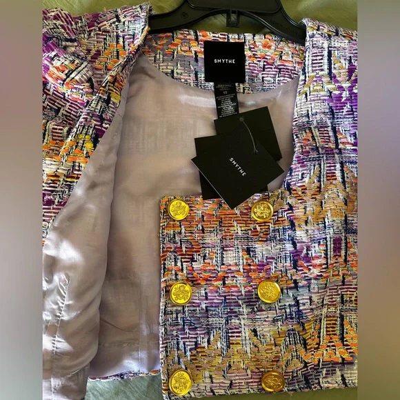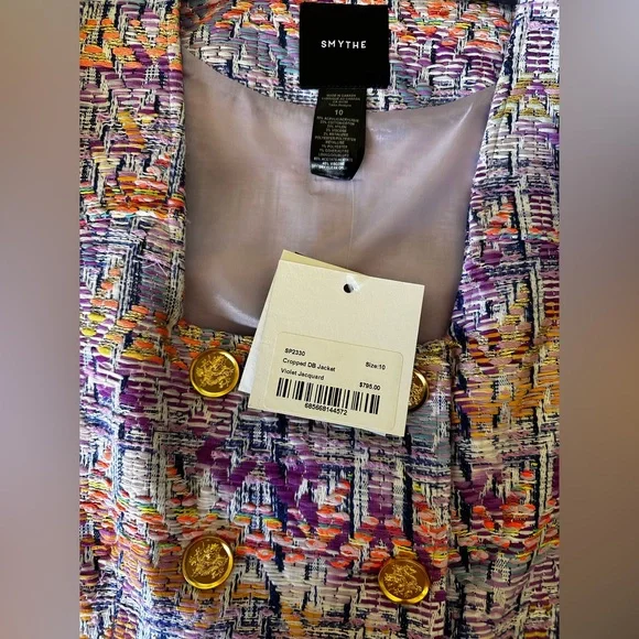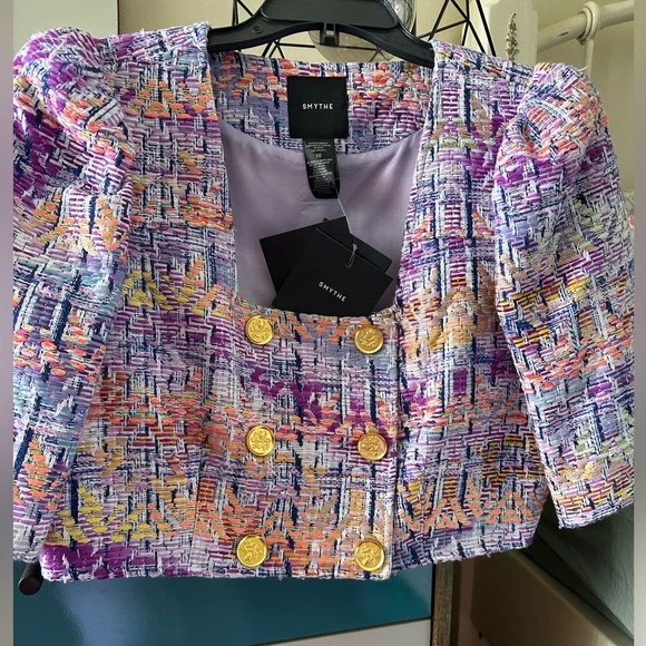 BRAND NEW WITH TAGS NEVER USED Details: Decidedly tailored through the bodice, this cropped double-breasted jacket features puff mutton sleeves, a square neckline and signature brass buttons. Curvy figures may wish to go up a size.Color: Violet JacquardSize: Model is 5'10, weighs 120 lbs and is wearing a size 2. Please use the Size Guide to determine your size.Content + Care: 50% Acrylic, 22% Cotton, 21% Nylon, 3% Viscose, 2% Metalized Polyester, 1% Other, 1% Polyester. Lining: 100% Cupro Rayon that is ecotoxicity-free and entirely biodegradable.Dry Clean Only.Made in CanadaVibrant tweed cropped jacket with gold buttons.
