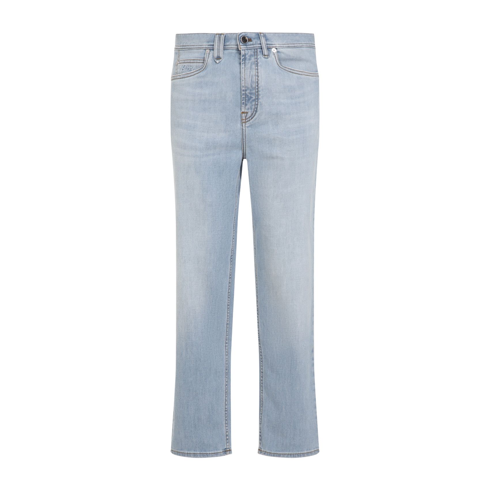 Brioni Merano Light Blue Cotton Jeans. Crafted from bleached light blue stretch cotton denim, mid-waist, belt loops, front button and fly-zip fastening, embroidered logo on the front, 5 pockets design, leather label at the back waistband, straight leg.