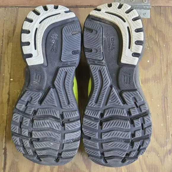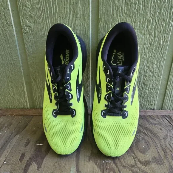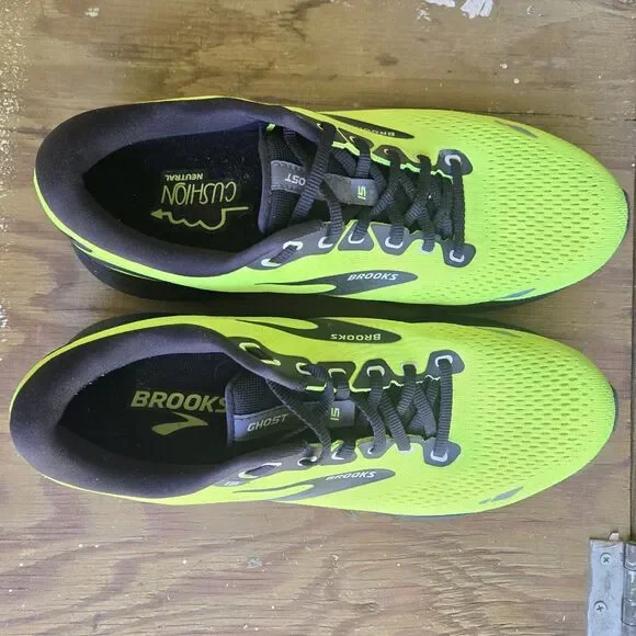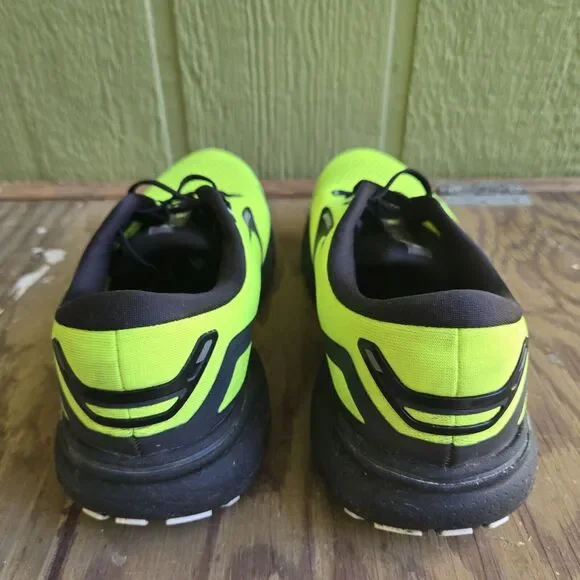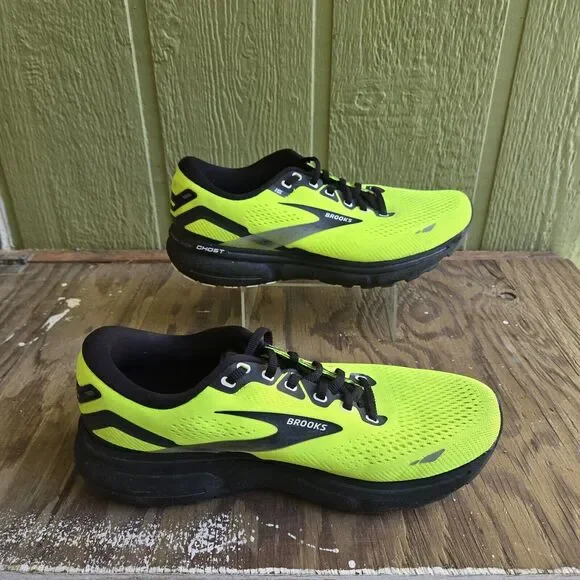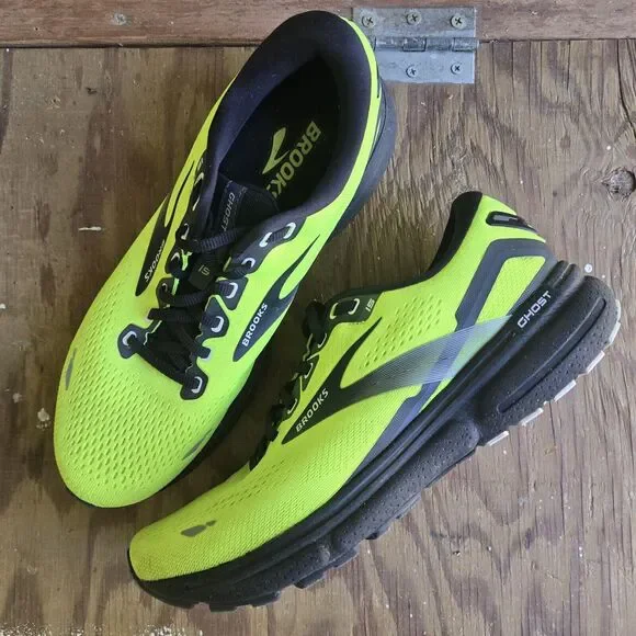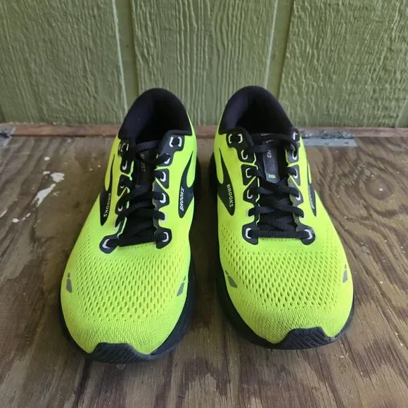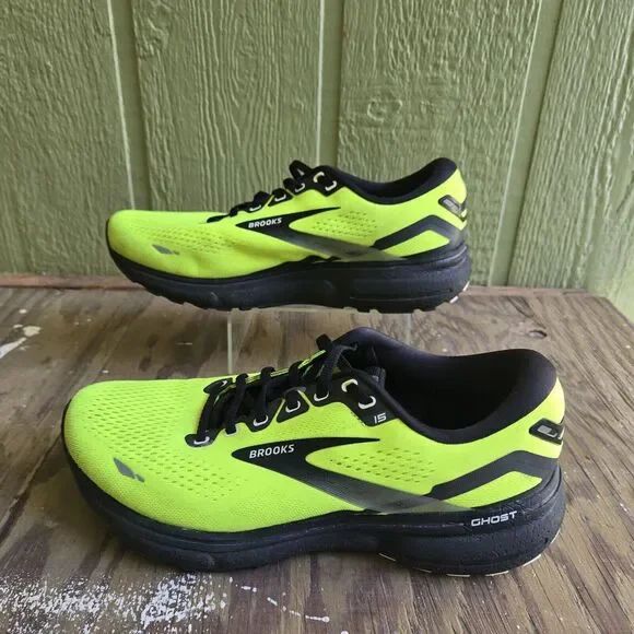 Ghost 15 neon green or highlighter yellow color. Mens size 9D. D is medium width. Features cushion neutral insoles, breathable mesh fabric. Perfect for running, walking, hiking, or any activity/job in which comfortable foorwear is needed.Fit vibes: athleisure, Outdoors, gorpcore, camping, bright, athletic wear, runner, normcore, normal