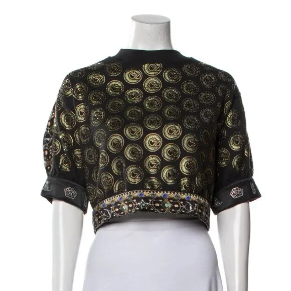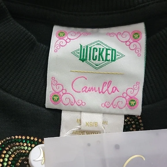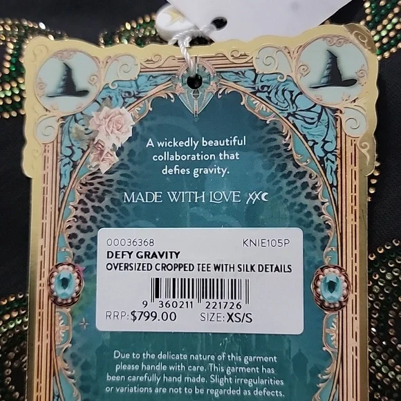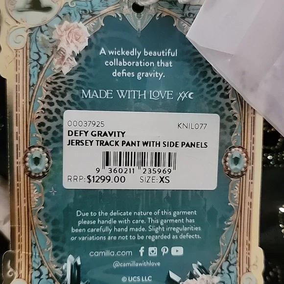 Note: these are originally sold separately, I am selling them as a set. If you'd like to purchase one of them separately, I will consider.Designed in Australia, The Defy Gravity Oversized Cropped Tee With Silk Details beckons you to the decadently enchanted land of Oz, where opulent gold embellishments and extravagant borders cascade through a bewitching realm, intertwining with dazzling greens and teals. Lovingly handcrafted, this cropped tee features a chic cropped length and short sleeves, accented with luxurious silk band details. The round neck completes this elegant piece, merging contemporary style with refined sophistication.- Cropped Length- Short Sleeves- Silk Band Details- Round Neck- Crystal EmbellishmentDesigned in Australia, The Defy Gravity Jersey Track Pant beckons you to the decadently enchanted land of Oz, where opulent gold embellishments and extravagant borders cascade through a bewitching realm, intertwining with dazzling greens and teals. Lovingly handcrafted, these luxury cotton track pants feature a relaxed silhouette, a contrasting waistband, a tapered hem and drawstring accents for your most perfect fit.- Elasticated waistband & cuffs- Easy fit- Drawcord- Crystal embellishmentNew with tags; no flawsTop: XS/SArmpit: approx. 24"Length: approx. 17.5"Pants: XSWaist: approx. 13" across, unstretchedRise: approx. 14"Inseam: approx. 30"See my closet for more Camilla & other great brands. Save when bundling 2 or more items!