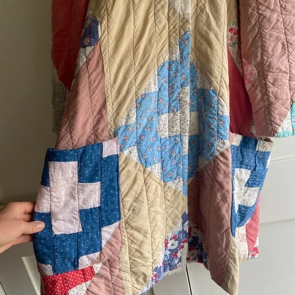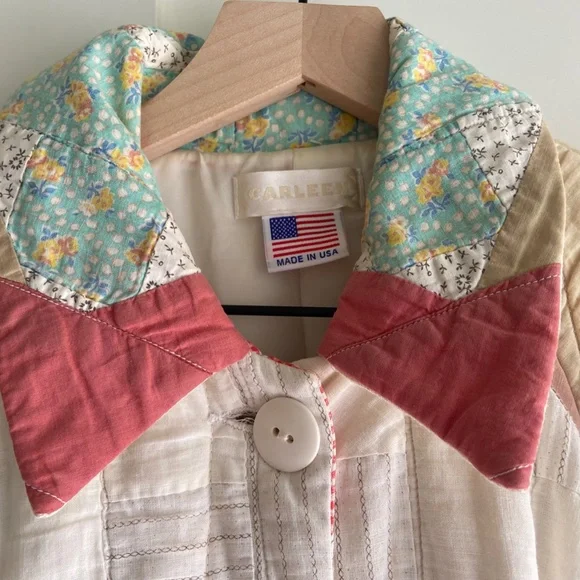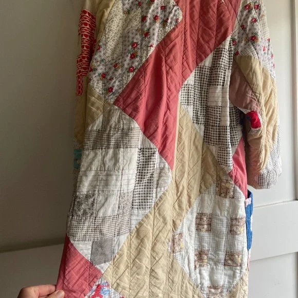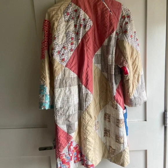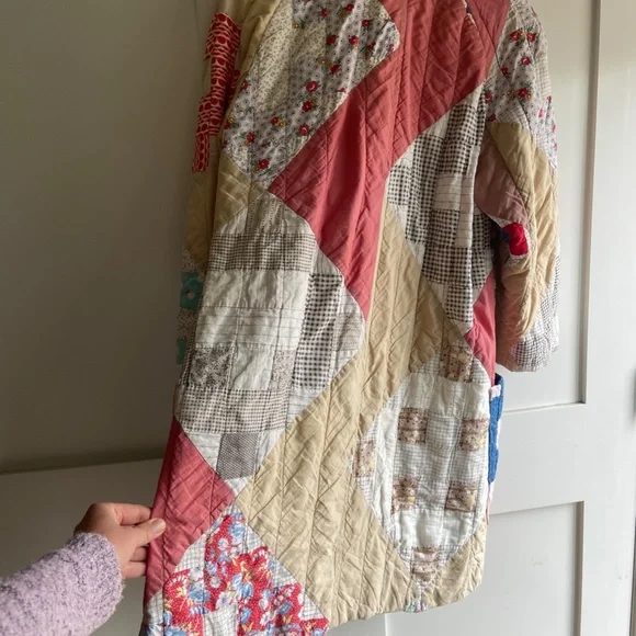 Beautiful one of a kind Carleen quilt coat. I absolutely adore this coat, and have gotten a million compliments the couple times I have worn it. That being said, this coast deserves to be worn more!! I don't reach for it as much as I should. Hoping it finds a better home here. There are a couple flaws (pictured) that are pretty unnoticeable- only apparent very close up.