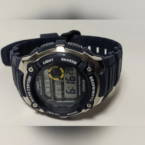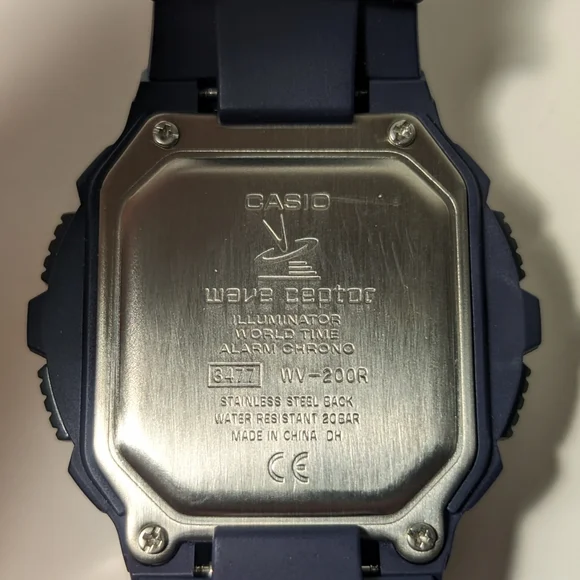 Casio digital watch with atomic timekeeping. Features multi-band 5 technology.Case size / weight: 52.2 x 47.7 x 15.2 mm / 58 gCase / bezel material: Resin / Stainless steelResin BandWater Resistance: 200-meter water resistanceMineral GlassApprox. battery life: Approx. battery life: 3 years on CR1620World time 29 time zones1/100-second stopwatchCountdown timerDaily alarmLED lightAfterglowFull auto-calendar (to year 2099)Button operation tone on/off12/24-hour format
