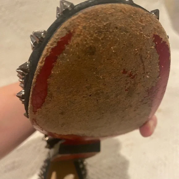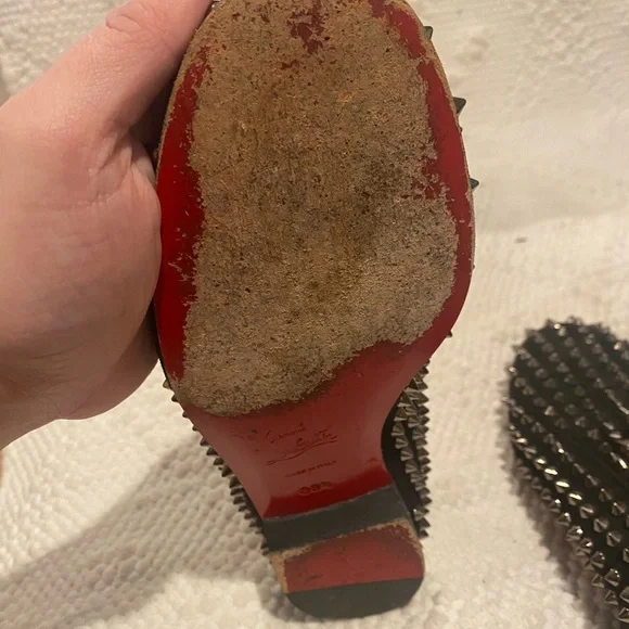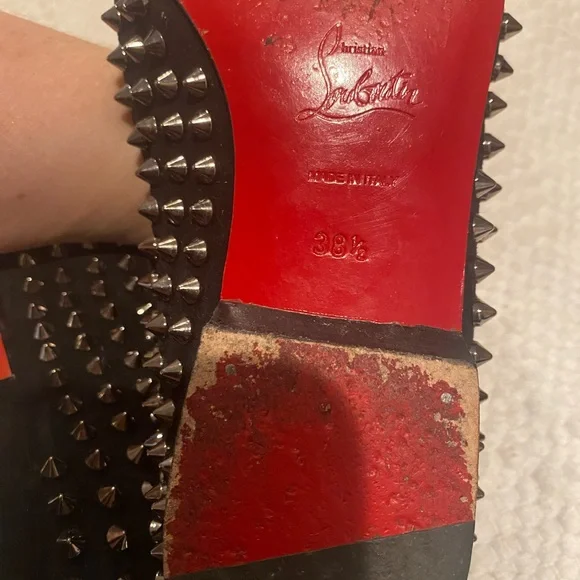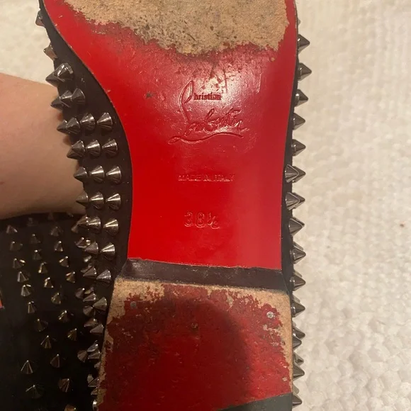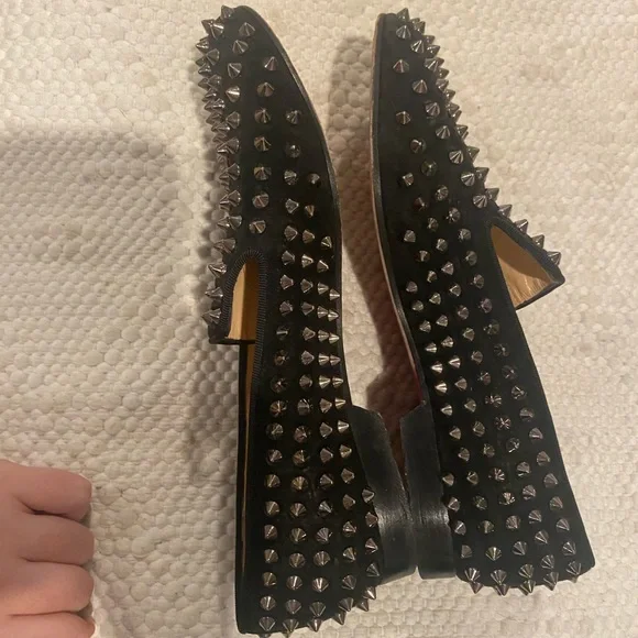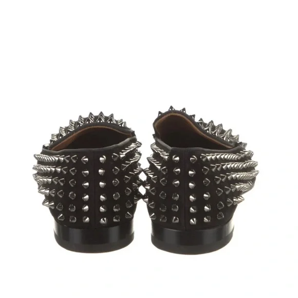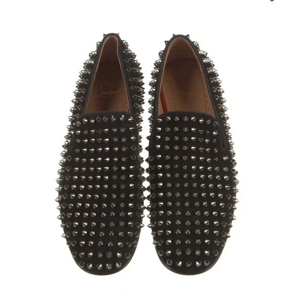 The Dandelion Spikes is one of the Christian Louboutin Maison’s iconic slipper loafers. With its pure, clean lines, this versatile flat slip-on shoe is a must for contemporary dressing. This carryover model boasts an upper meticulously crafted from soft veau velours in classic black, complemented with all-over spikes for an edgy twist. The silhouette is embellished with a grosgrain trim, while the sole is highlighted in signature red, offering a touch of luxury in inimitable Louboutin style.Please see photos of actual item for condition Stylish loafers with bold spikes. Iconic red soles. Perfect for a statement look.