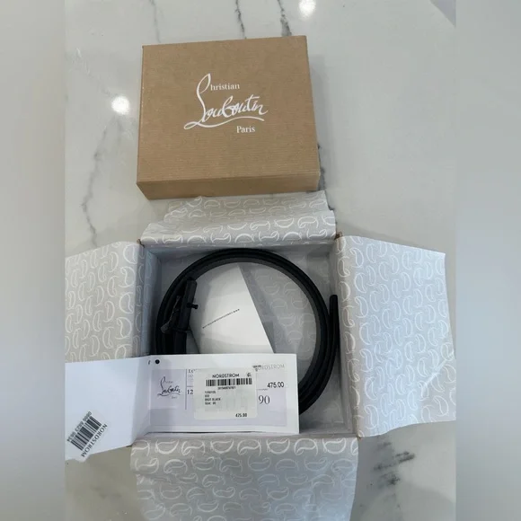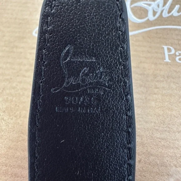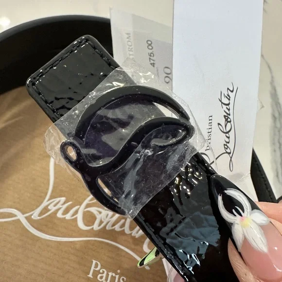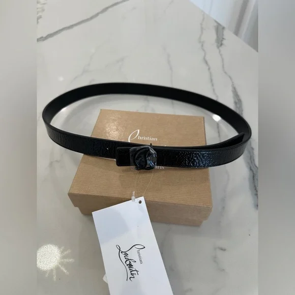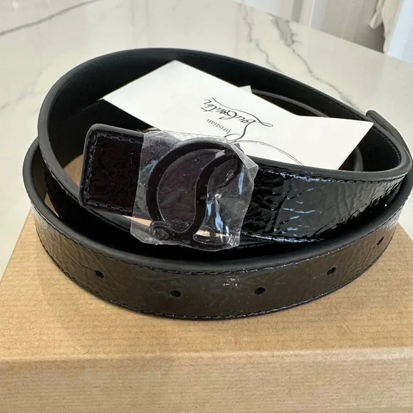 Brand new with tags. 100% AuthenticChristian Louboutin Loubi54 BeltSize 90cm /36”Width 1”Color- Black PatentThe Loubi54 reversible belt is made from black Patent Vog leather and showcases a tonal metal buckle adorned with the signature CL logo. The "Vog patent leather" wrinkled effect may exhibit minor differences between the image and the actualFeatures:Material: Patent Vog leatherHardware: Tonal-toneReversibleIncludes original box and dustbag for storageComes exactly as shown in photos. Retail $475 plus tax
