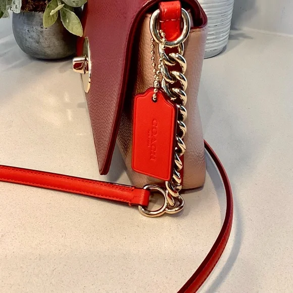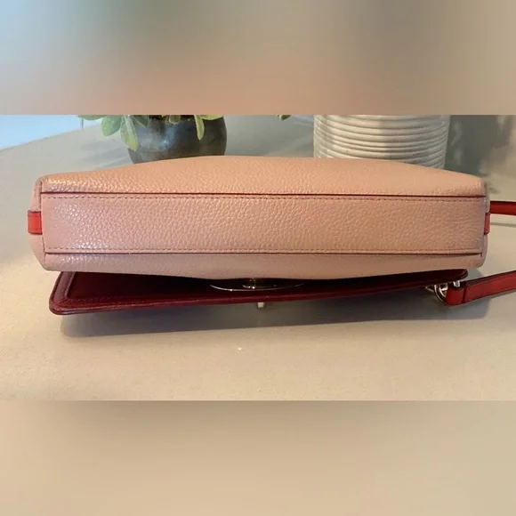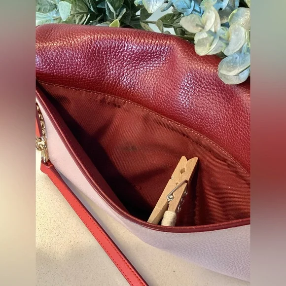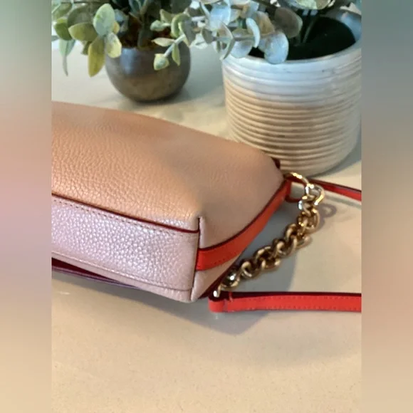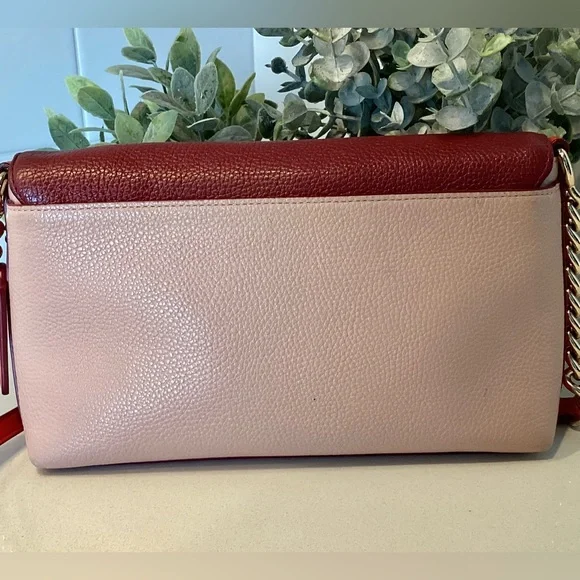 This is such a striking, colorful handbag. It is pink, red, and burgundy with gold chain and gold closure hardware.Measures: 9.5”l x 5.5”h x 1.5”dStrap drop: 22.5”Very little wear. Hard to find any flaws.Very very minimal wear to corners. A dark mark on fabric inside the side pocket. That’s it… hard to find anything wrong with it. Please reach out with questions, happy to help.