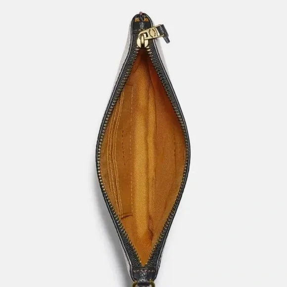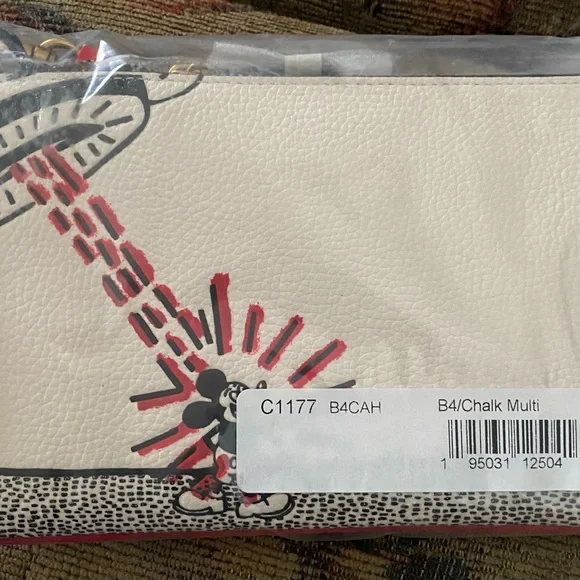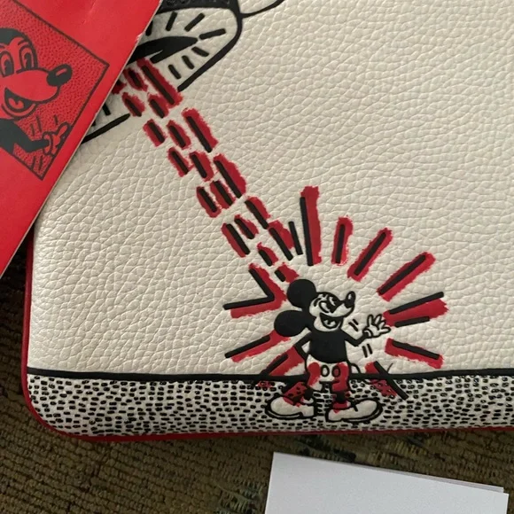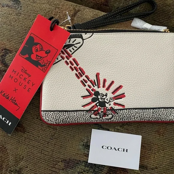In a special collection, Coach collaborates with Disney and the Keith Haring Studio to celebrate the iconic artist's playfully subversive illustrations of the one and only Mickey Mouse. Crafted of polished pebble leather featuring the famed American artist's original artwork depicting a UFO encounter, this wristlet is perfectly sized for cards, cash and a phone. Wear it on your wrist or clip it inside a larger Coach bag. Polished pebble leatherZip-top closure, fabric liningDetachable wrist strap7 1/2" (L) x 4 3/4" (H) x 1/2" (W).Comes from a smoke free home.Soooo Cute!