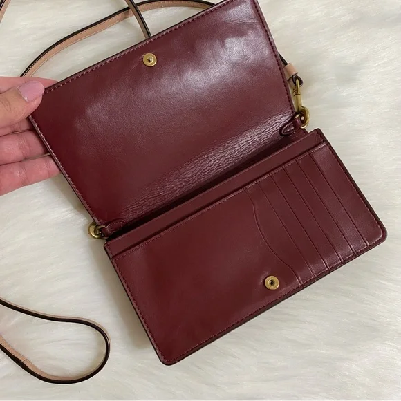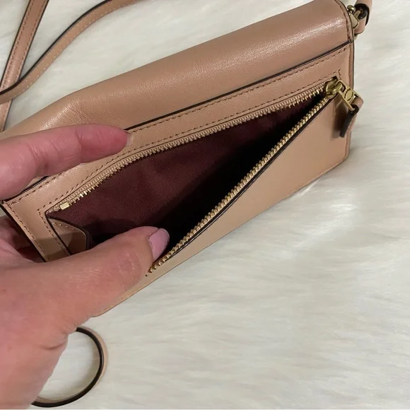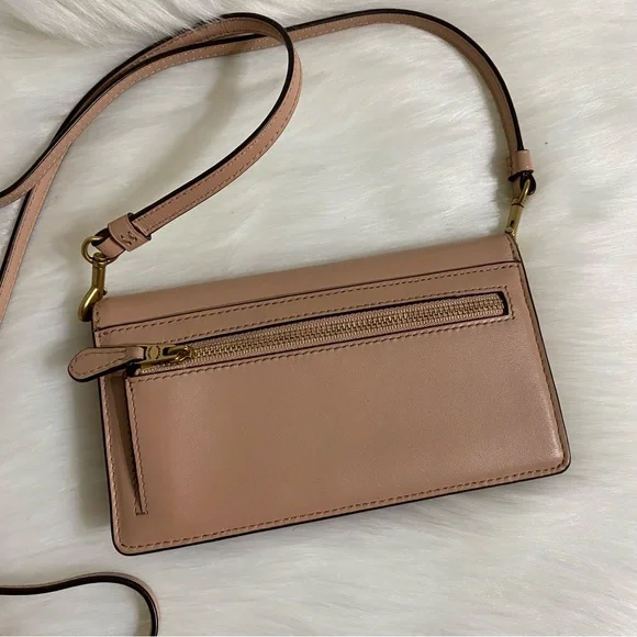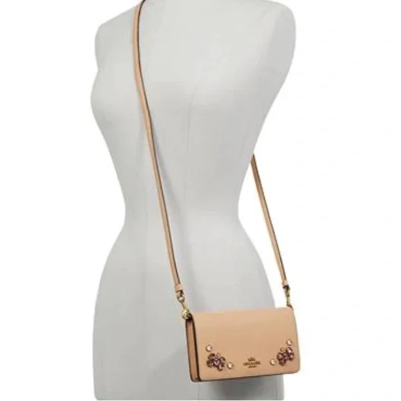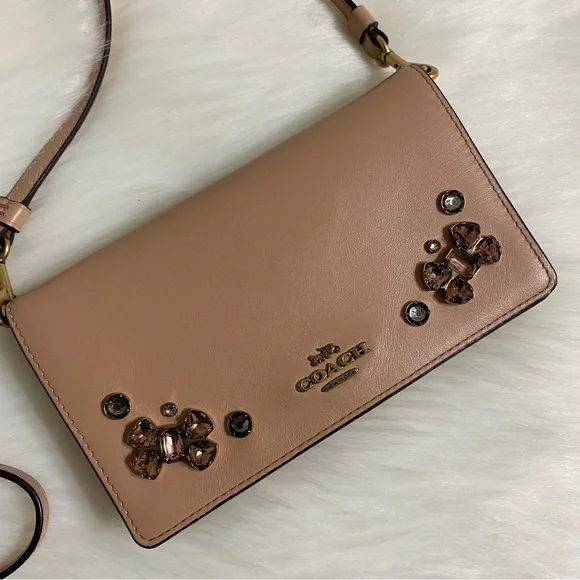 Coach Hayden Foldover Crossbody WOC Clutch With Jewel Crystals - BeechwoodDecorative crystals sparkle at the corners of a crossbodycomplete with card slots, a phone pocket and optional strap.• Mini sized bag; 7"W x 3-3/4"H x 1/2"D(width is measured across the bottom of handbag)• 23"L adjustable removable strap• Snap button closure• Gold-tone exterior hardware & 1 zip pocket1 interior bill compartment, 1 phone compartment& 6 credit card slots;• Style No: 38932• Smooth Leather• Excellent Like New Condition⭐️ Posh Ambassador ⭐️✨Pet Free & Smoke Free Home!✨✅ Fast Shipping 🚫No Trades