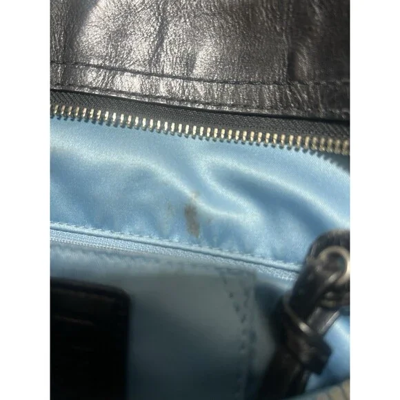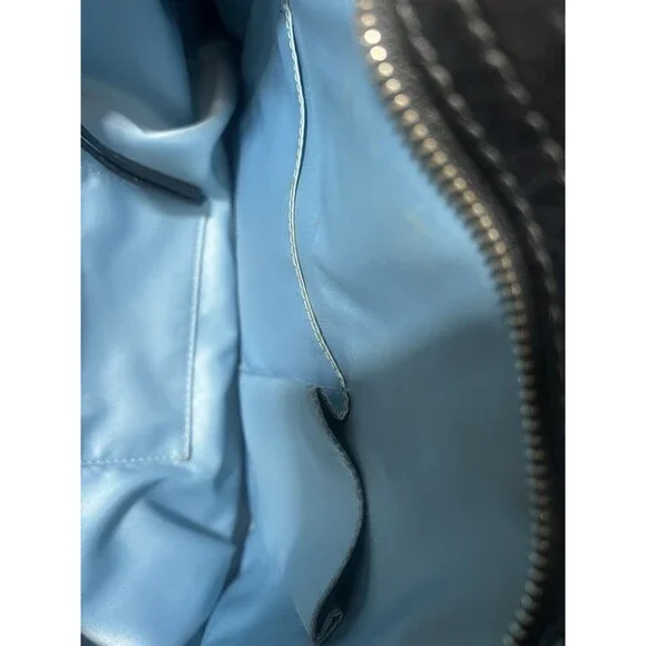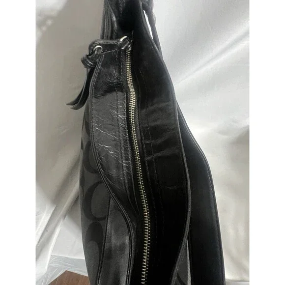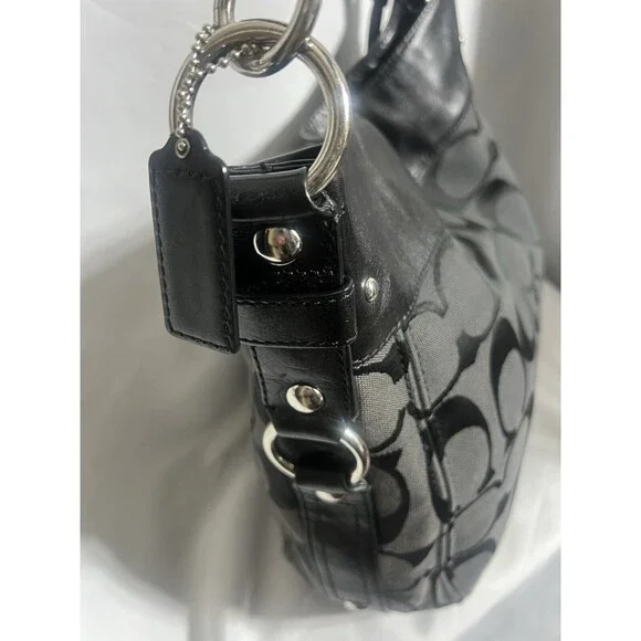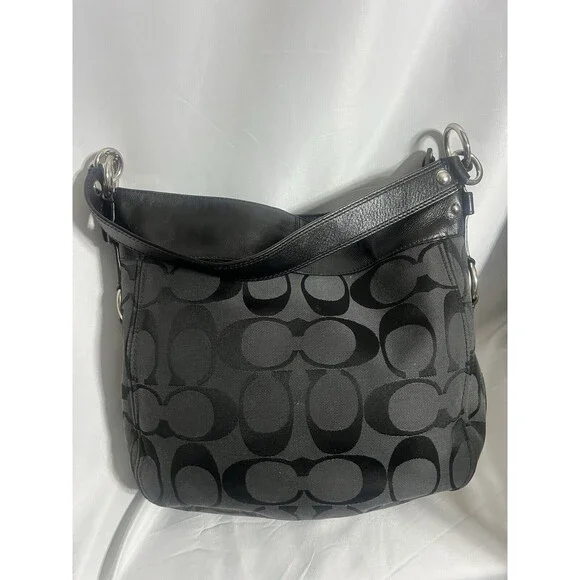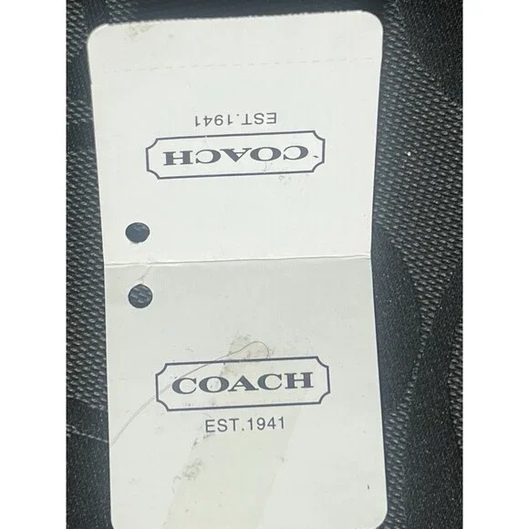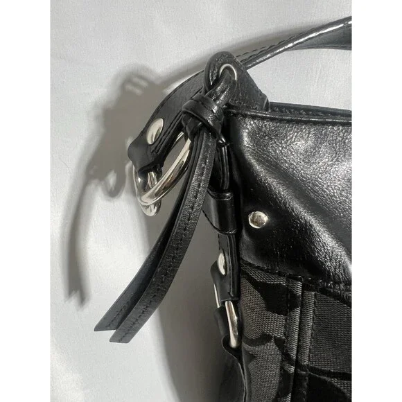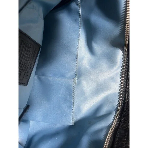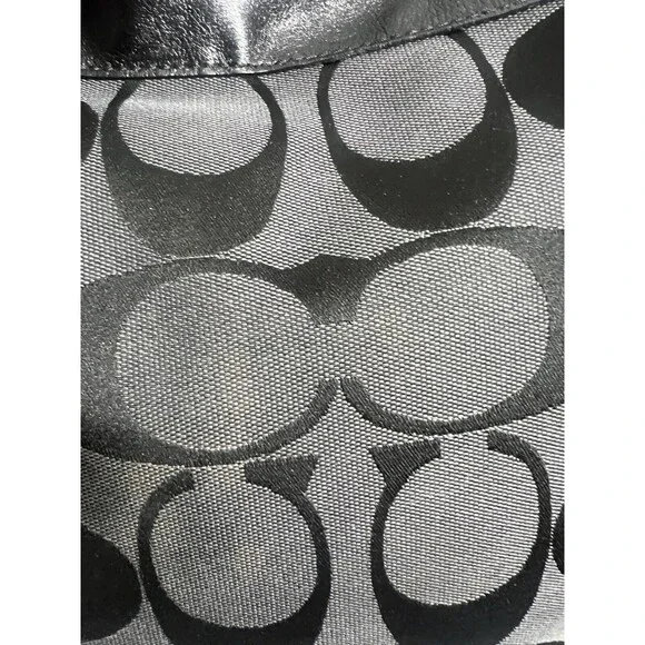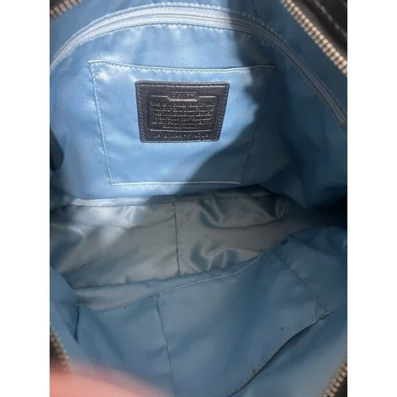 This Coach Shoulder Bag features a stylish design with a black leather handle/strap and a multicolor canvas exterior in dark gray tones. The bag is a versatile accessory suitable for everyday use, with a blue lining adding a pop of color to the interior. The combination of leather and canvas materials showcases a mix of durability and style, making this shoulder bag a practical and fashionable choice for women looking for a high-quality handbag.Leather strap and top part and rest is canvasStill has original tag in bag, hasn't been used