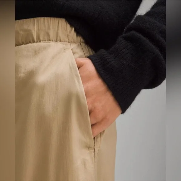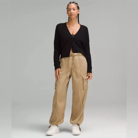 One pant, two looks. These lightweight, baggy cargo pants can be worn straight or cinched at the bottom for a tapered, jogger-like fit. Lightweight, Drapey Fabric• Lightweight• Natural hand feel• Has a lived-in, crinkly look• Fabric is derived from responsibly sourced wood-based materials that support the protection of ancient and endangered forests• 100% of the polyester in this product is recycled (excluding trims)Mid Rise, Full Length• Full length intended to sit at ankle• Oversized fit• Hand pockets with hidden card sleeve• Cargo pockets• Pull and tie the drawcords at the hems to change the shape• Elasticated waistband with adjustable drawcordCare and contentProduct Care• Wash with like coloursRoc Machine wash coldA Do not bleach• Tumble dry low& Do not iron& Do not dry clean• ImportedFabric content• Pocket: 86% Recycled Polyester, 14%Elastane• Body: 81% Tencel Lyocell, 17% Nylon, 2%ElastaneColor Filbert TanThese run large. Usually a size 2 in Lululemon and these fit well. Price is firm. I’ll keep em if they don’t sell for listed price.