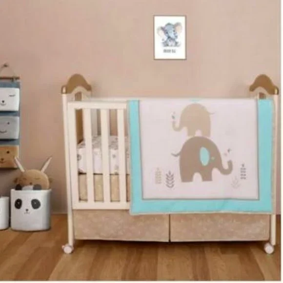 Cuddles & Cribs Soft Cotton 4 Piece Baby Crib Bedding Set with Reversible Comforter (Elephant Family). Cuddles Cribs Crib Bedding Set 4 Piece This reversible comforter easily switches up the style of bedroom with help from Butterfly, Cute Elephant, FoxFamily, Safari, Grey Checks, and Pink Check. This high-quality crib bedding is an enduring choice thats sure to become a favorite in any childs collection. Bring a sense of fun and adventure to bedtime with colorful patterns. Kids will love these patterns and parents will appreciate the quality and style of this baby crib bedding set. Package Include Size Details: The 4-piece baby crib bedding set comes with 1 reversible comforter, 2 fitted 100% cotton crib sheets and 1 100% cotton crib skirt. The crib sheet dimensions 28 x 52 + 8 inches that fits a standard crib mattress Comforter with polyester filling dimension 33 x 42 inch Crib skirt dimension 28 x 52 + 10 inches. EASY CARE: Wash before first use. Machine wash cold, gentle cycle. Use only non-chlorine bleach when needed. Tumble dry low. IDEAL GIFT: Beautiful packaging makes it an ideal gift for Baby Showers, Baby Registry, Christmas, Birthdays, and Thanksgiving.