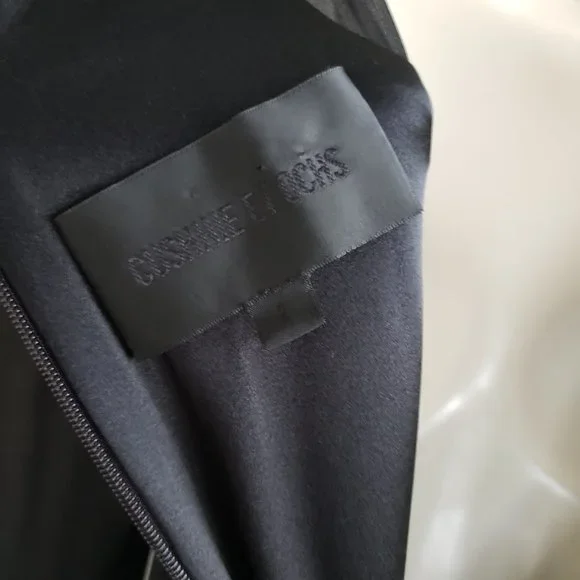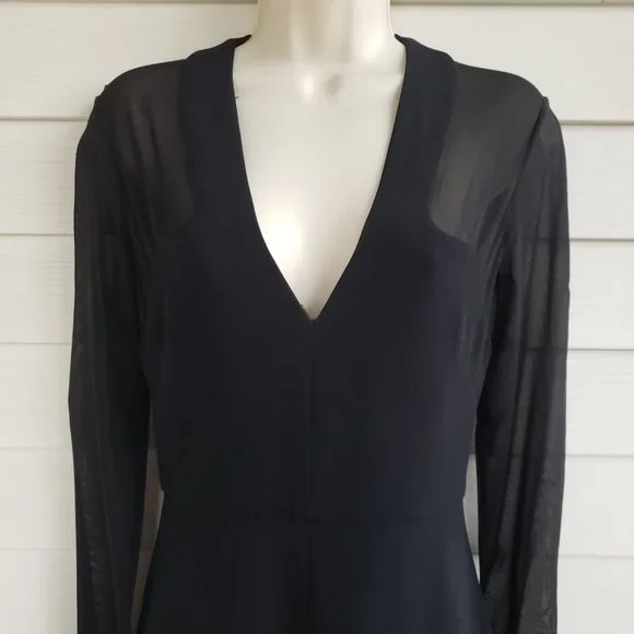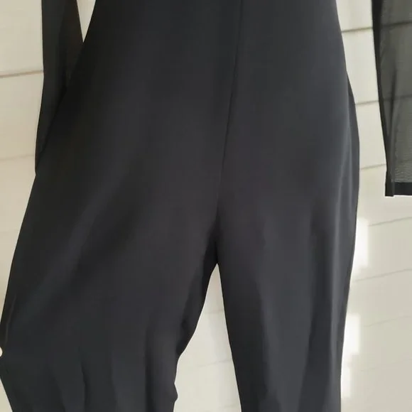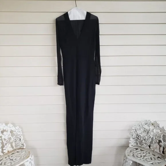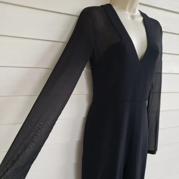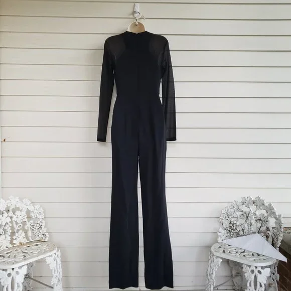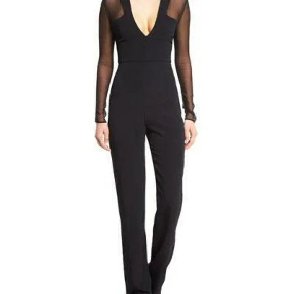 This is an amazing like new black crepe jumpsuit with sheer sleeves from Cushnie Et Ochs.It is in excellent condition and I has just been freshly dry cleaned.It is tagged a size 2. Material is97% VISCOSE and 3% ELASTANE. There is some stretch in it. Please check measurements.There is a hidden zipper down the back, a V-neck, and sheer sleeves.Please check measurements.Measurements while jumpsuit laying flat:-Across chest underarm to underarm 15" stretches to 17"-Across waist 13" stretches to 14.5"-Across hips 18" stretches to 20.5"-Top of shoulder to crotch 32"-Inseam 35"