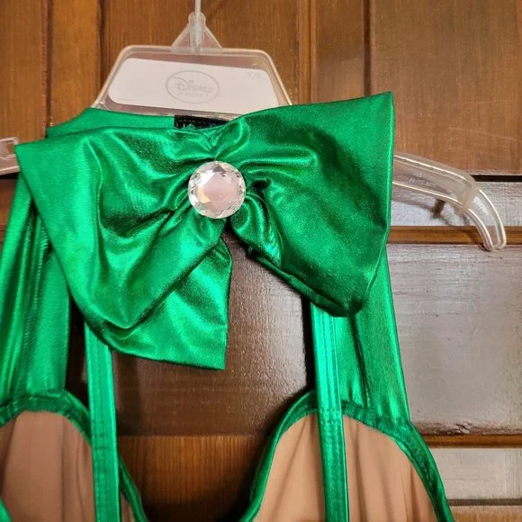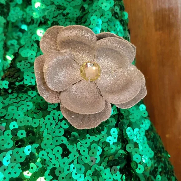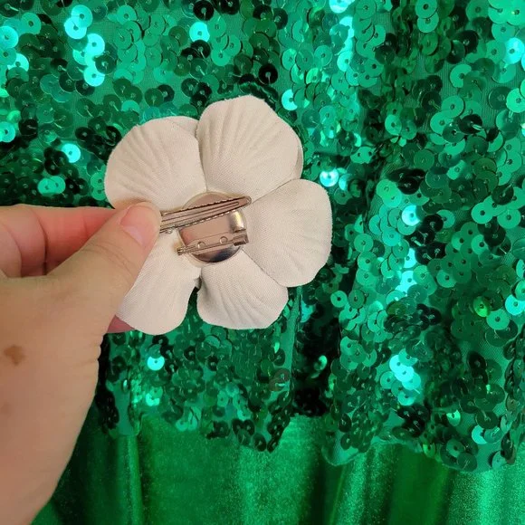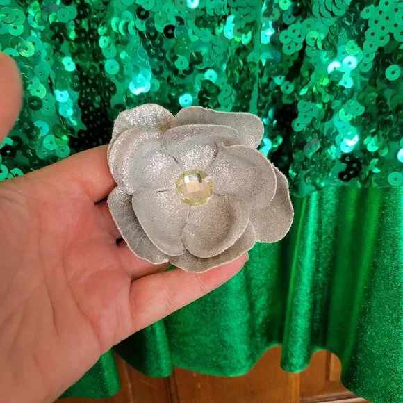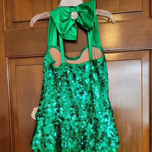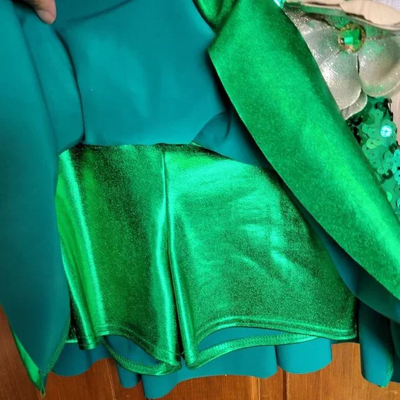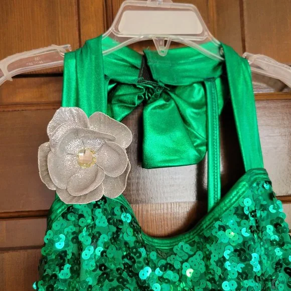 Sparkly Green Dress -- Perfect for Dance Performances or Ice Skating Programs*Green Sequin Top with satin skirt*Pretty Bow "tie" in back -- it actually snaps*Silver Flower accent on dress*Silver Flower clip to match for hair accessory*Shorts vs leotard *Worn for a Holiday Show performance *I don't know the brand -- it was ordered via the holiday show director*Measurements --