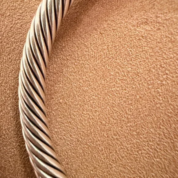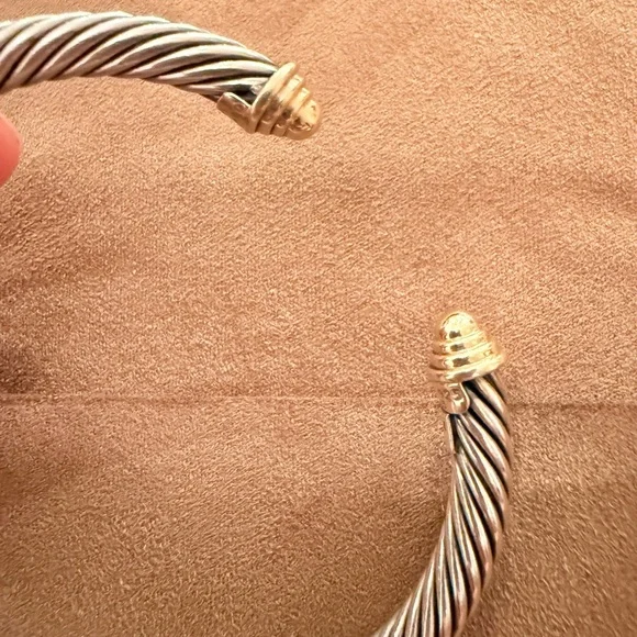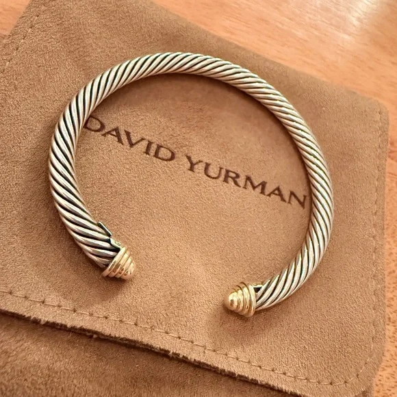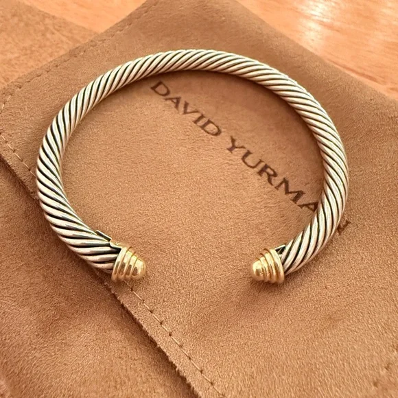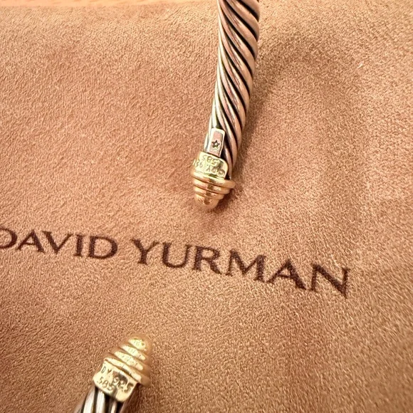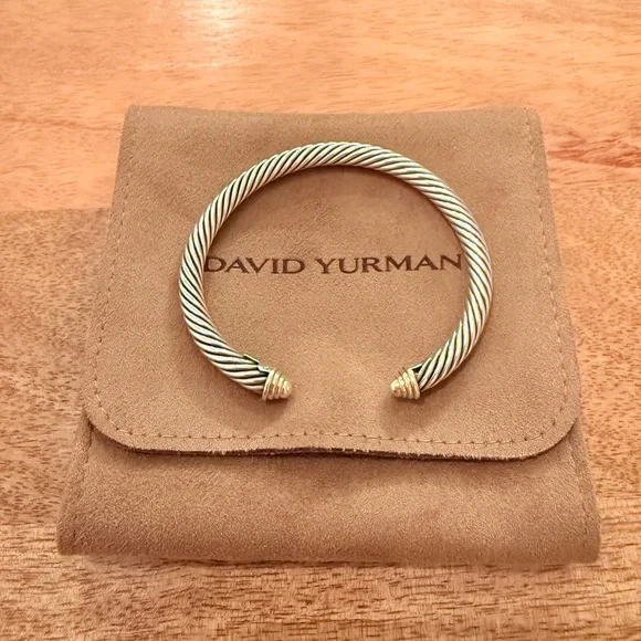 This exquisite David Yurman bracelet showcases a signature twisted cable design in a luxurious blend of silver and gold. The open cuff style is adorned with elegant end caps, offering a timeless and sophisticated look. Perfect for elevating any ensemble with its classic and minimalist appeal.Worn a couple of times, just don’t reach for it. 100% authentic. Comes with original dust bag. EUCPhotos are in natural and overhead lighting for clarity on color.