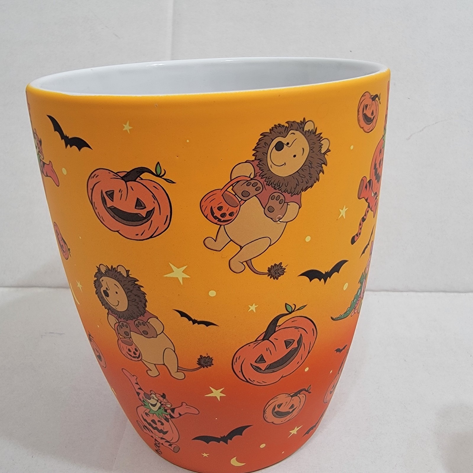 This Disney Winnie The Pooh Halloween Oversized 25 oz coffee Mug Soft Touch ombre features beloved characters winnie the pooh, Tigger, Eeyore, and Piglet dressed in Halloween costumes. The mug is part of the contemporary Disney franchise and is sure to delight fans of the Winnie the Pooh series. With its charming design and oversized size, it makes for a playful and festive addition to any Disney collection.