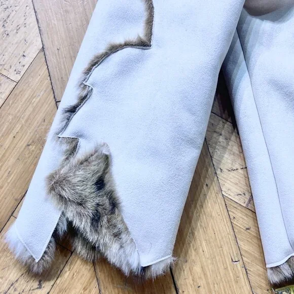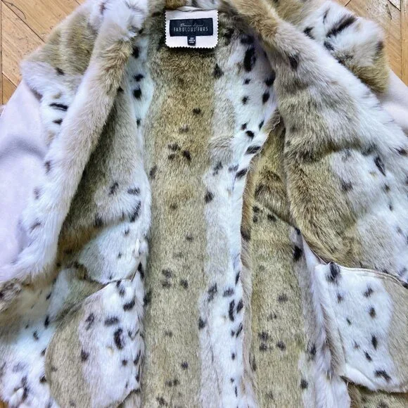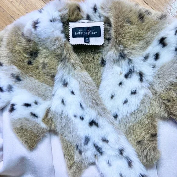 High end faux shearling (suede / fur) cropped jacket. Raw edge with asymmetrical patchwork seam detail. Snow leopard / lynx print on the fur inside, cream-white suede on the outside. Button closure. Designer: Donna Salyers Fabulous Furs. EUC, no wear. 2X, measurements in pics.✨Interested? Make offer. Items are x-listed & some go quickly. Follow for 20+ yr collection of vintage, statement, designer, XS-XL. First looks on IG, in bio.✨