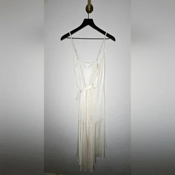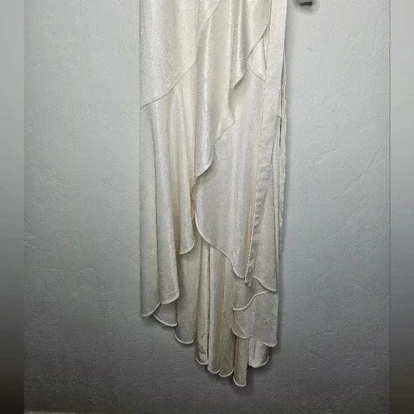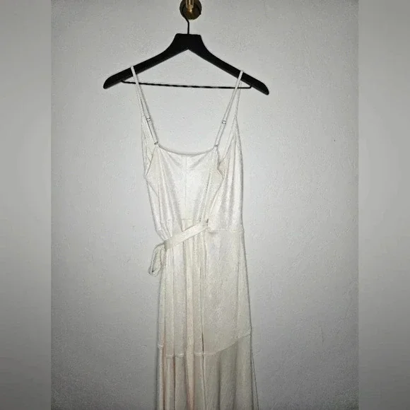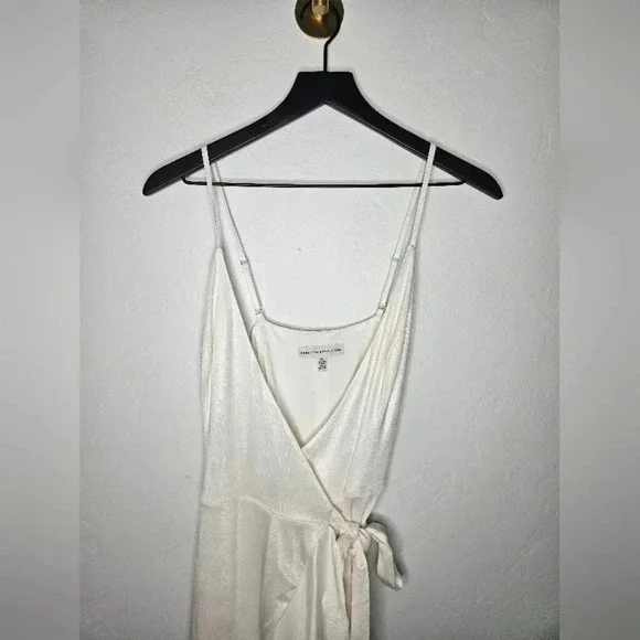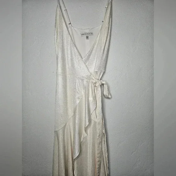 Key Features:- Design: Featuring adjustable spaghetti straps and a crossover deep V neckline, this dress exudes elegance and allure.- Fabric: Crafted from 100% polyester, our dress offers a lightweight and breathable feel with a touch of luxury.- Gathered Bust Detail: The gathered detail at the bust adds texture and visual interest, enhancing the overall silhouette.- Empire Waist: Designed with an empire waistline and elasticized waist for a flattering fit that accentuates your figure.- Waist Tie and Belt Loops: Complete with side belt loops and a waist tie, allowing you to cinch the dress for a customized look.- Ruffled High Low Hem: The ruffled high low hem adds a playful and romantic touch to the wrap silhouette.- Wrap Silhouette: Embrace the timeless wrap silhouette, offering versatility and effortless style.- Back Zip Closure: Equipped with a back zip closure for easy and secure fastening.